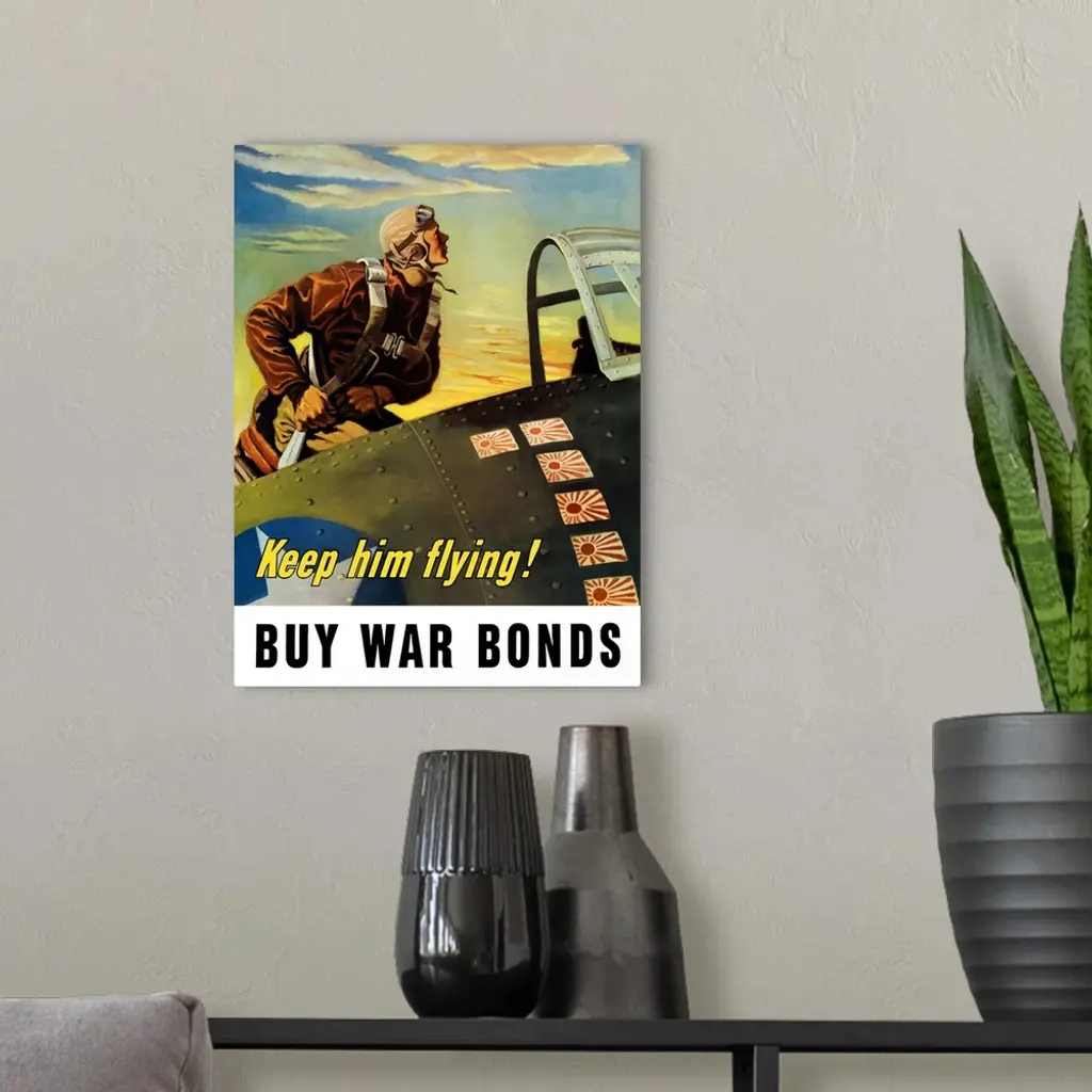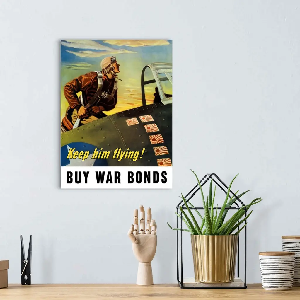 Vintage World War II poster of a fighter pilot climbing into his airplane. It reads, Keep him flying! Buy War Bonds.
