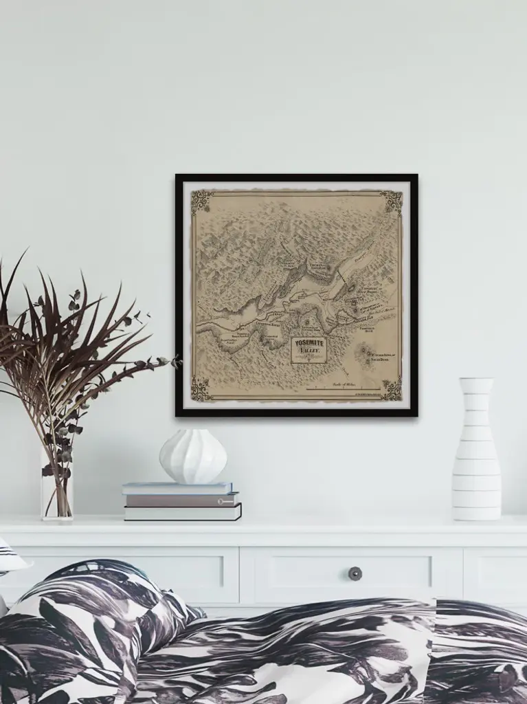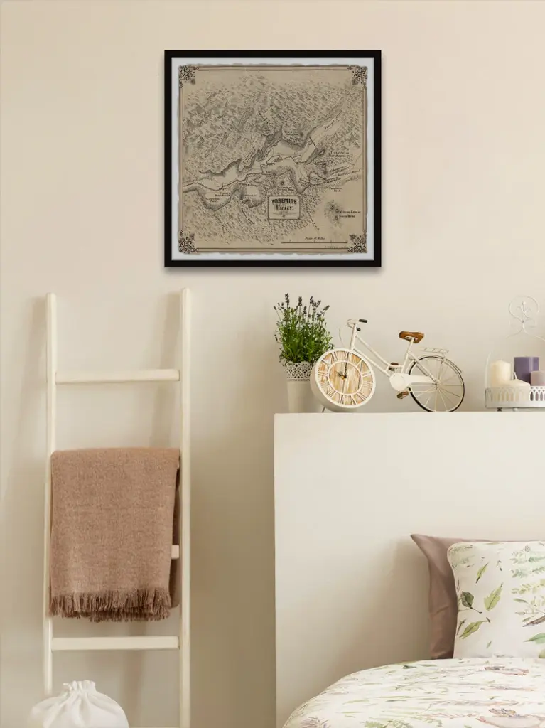 This beige vintage map features Yosemite Valley and all of its most loved features. Proudly printed in the USA, this piece is printed on high quality archive paper and professionally hand-framed. With wall-mounting hooks included, this artful accent is ready to hang up as soon as it reaches your front door.- Top quality Gicle print on high resolution Archive Paper- Hand cut deckled edges- High quality durable non-warping frame- Finished under shatter resistant plexiglass- Arrives ready to hang- Includes a certificate of authenticity- Printed in the USA