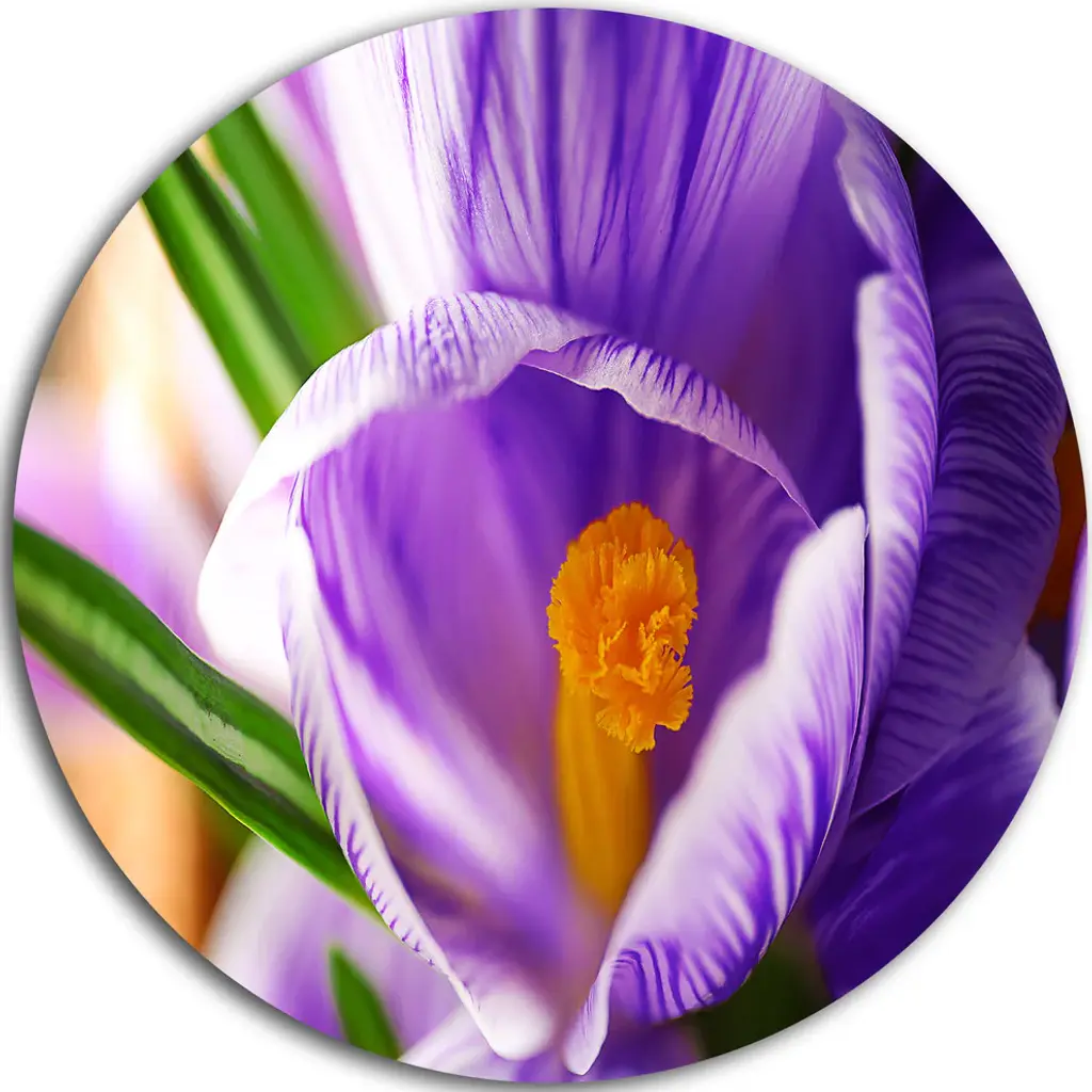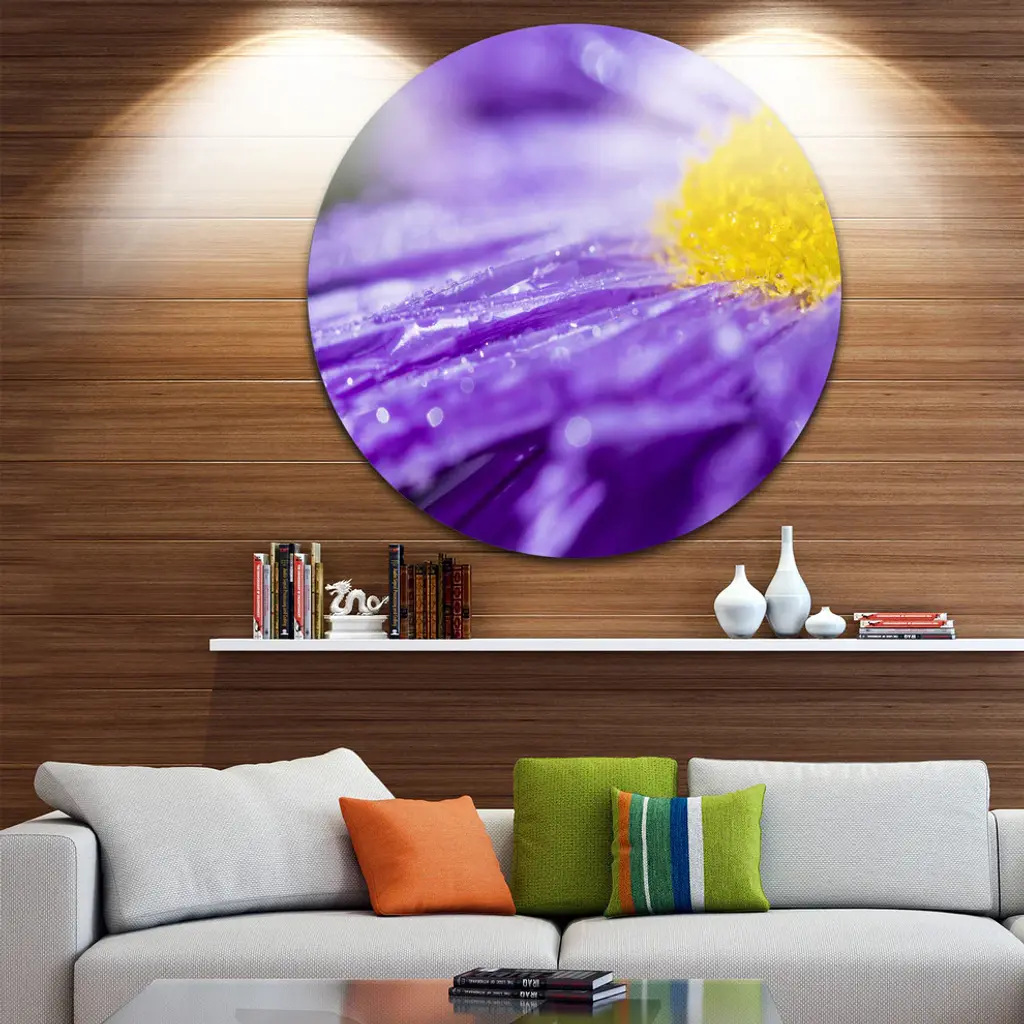 Bring Contemporary Abstraction to your home with this large Circle Metal wall art. This Large Violet Flower Petal Close-up Metal Artwork makes it the focal point of any room or office. - White Gloss Coating ensures colors are extra vibrant with light reflection.- Aluminum grade Sheet Metal with 1 inch mounting frame on the back giving the illusion that the artwork is floating on the wall..- Mounting Brackets are included along with instructions.- High Quality Digital images are created directly into a glossy aluminum panel producing a stunning and captivating print into the glossy finish of the metal.- Water, Fire and Scratch resistant HD Aluminum panels.- Looks better than any photo paper and guaranteed to last at least 20 years- Easy to clean with a microfiber cloth. Colors are far superior to regular Canvas Art. - Easy to Hang