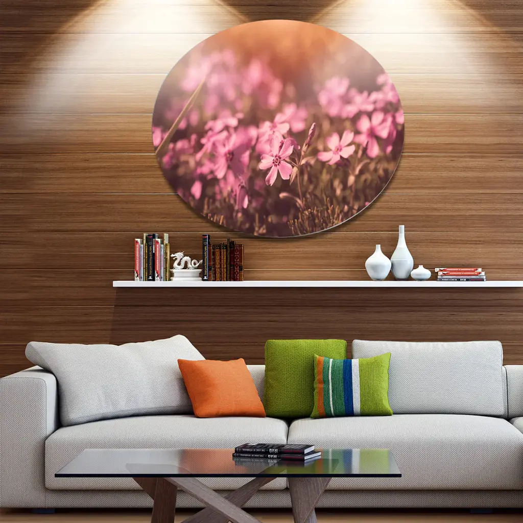 Bring Contemporary Abstraction to your home with this large Circle Metal wall art. This Violet Flowers in Vintage Style Metal Artwork makes it the focal point of any room or office. - White Gloss Coating ensures colors are extra vibrant with light reflection.- Aluminum grade Sheet Metal with 1 inch mounting frame on the back giving the illusion that the artwork is floating on the wall..- Mounting Brackets are included along with instructions.- High Quality Digital images are created directly into a glossy aluminum panel producing a stunning and captivating print into the glossy finish of the metal.- Water, Fire and Scratch resistant HD Aluminum panels.- Looks better than any photo paper and guaranteed to last at least 20 years- Easy to clean with a microfiber cloth. Colors are far superior to regular Canvas Art. - Easy to Hang