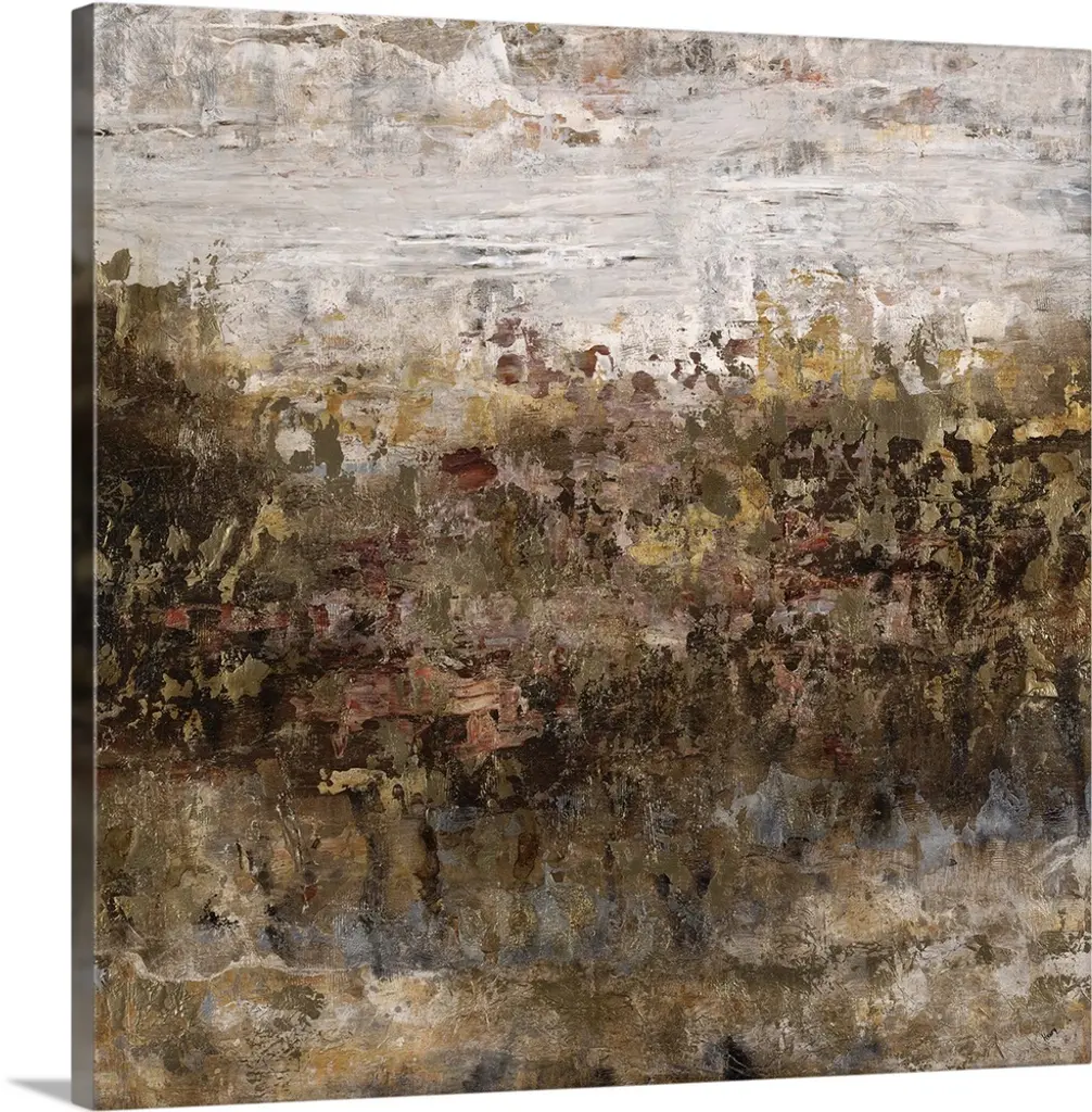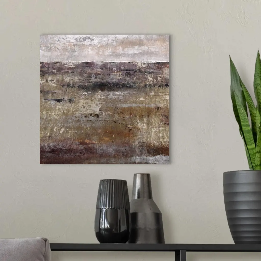 Contemporary artwork of a dark landscape in brown under a light grey sky.