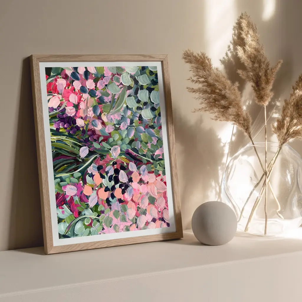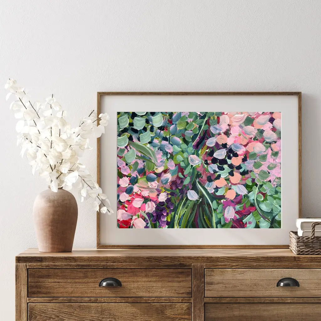 From serene tonal greens to vibrant violets and fluorescent pinks, this abstract floral print captures the beauty of glorious days full of sunshine and blossom trees as well as the unassumingly captivating corners of woodlands and murky rivers. Rich violets, muted lilacs, tonal greens and pops of pink will add a stunning splash of colour to interior spaces. Printed on heavyweight 316gsm cotton rag textured paper using archival-quality inks, this A3 giclée print will maintain its beautiful vibrancy for many years to come. Each print has a white border so it can easily fit into a standard size frame. Print is sold unframed.
