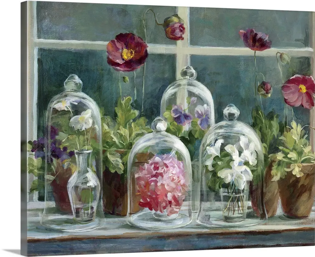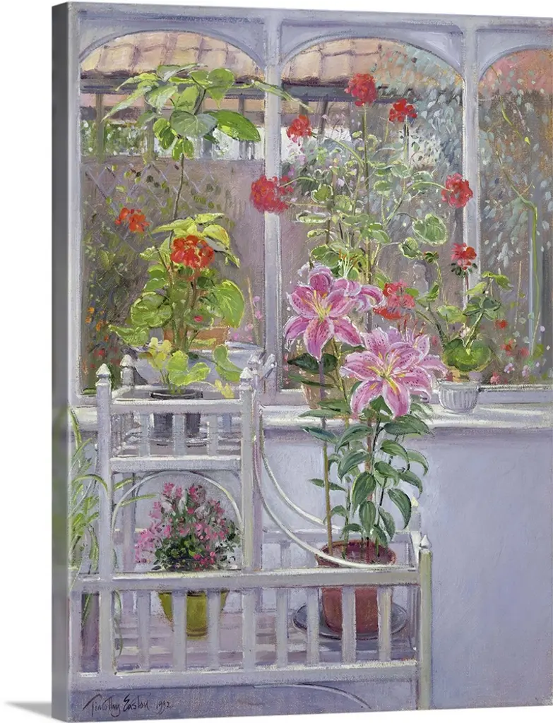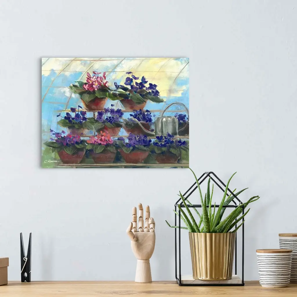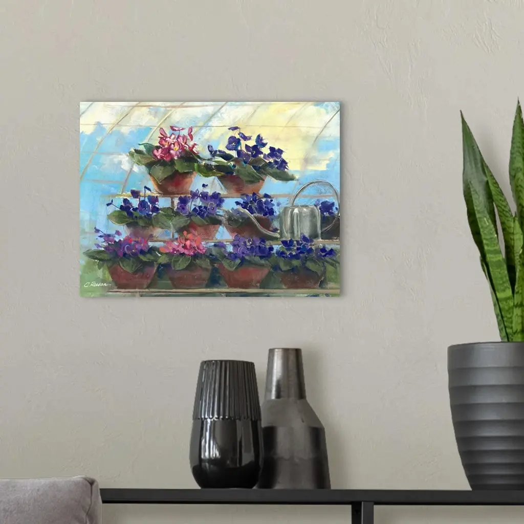 Contemporary painting of potted flowers in a greenhouse.