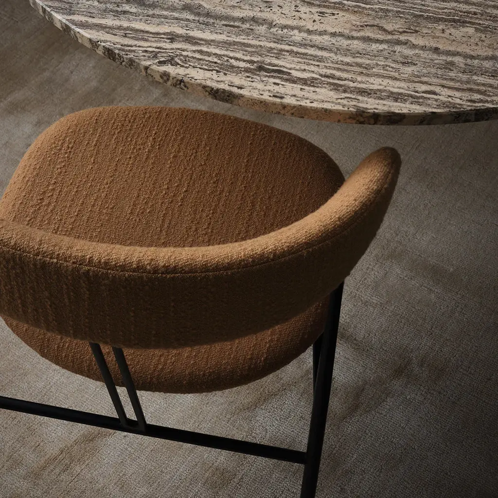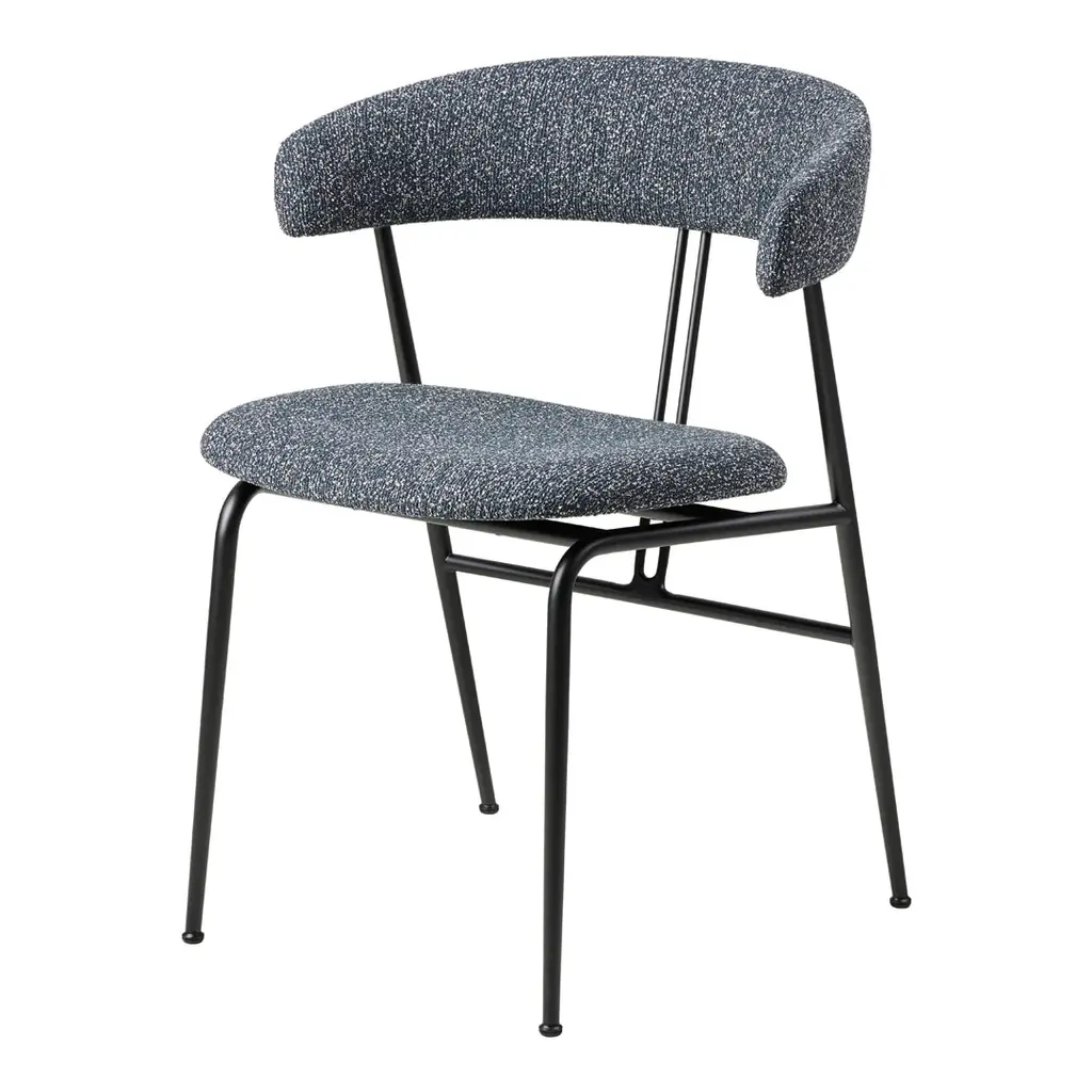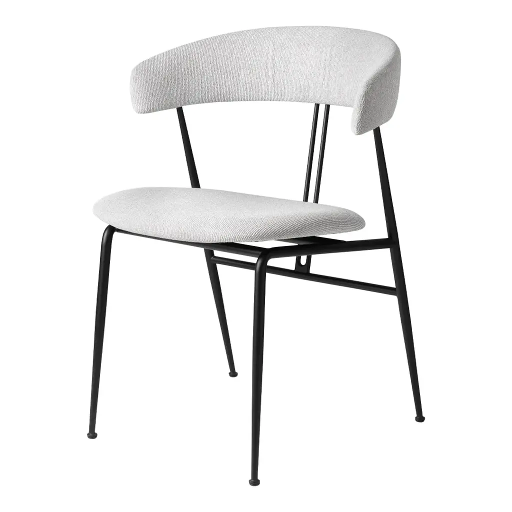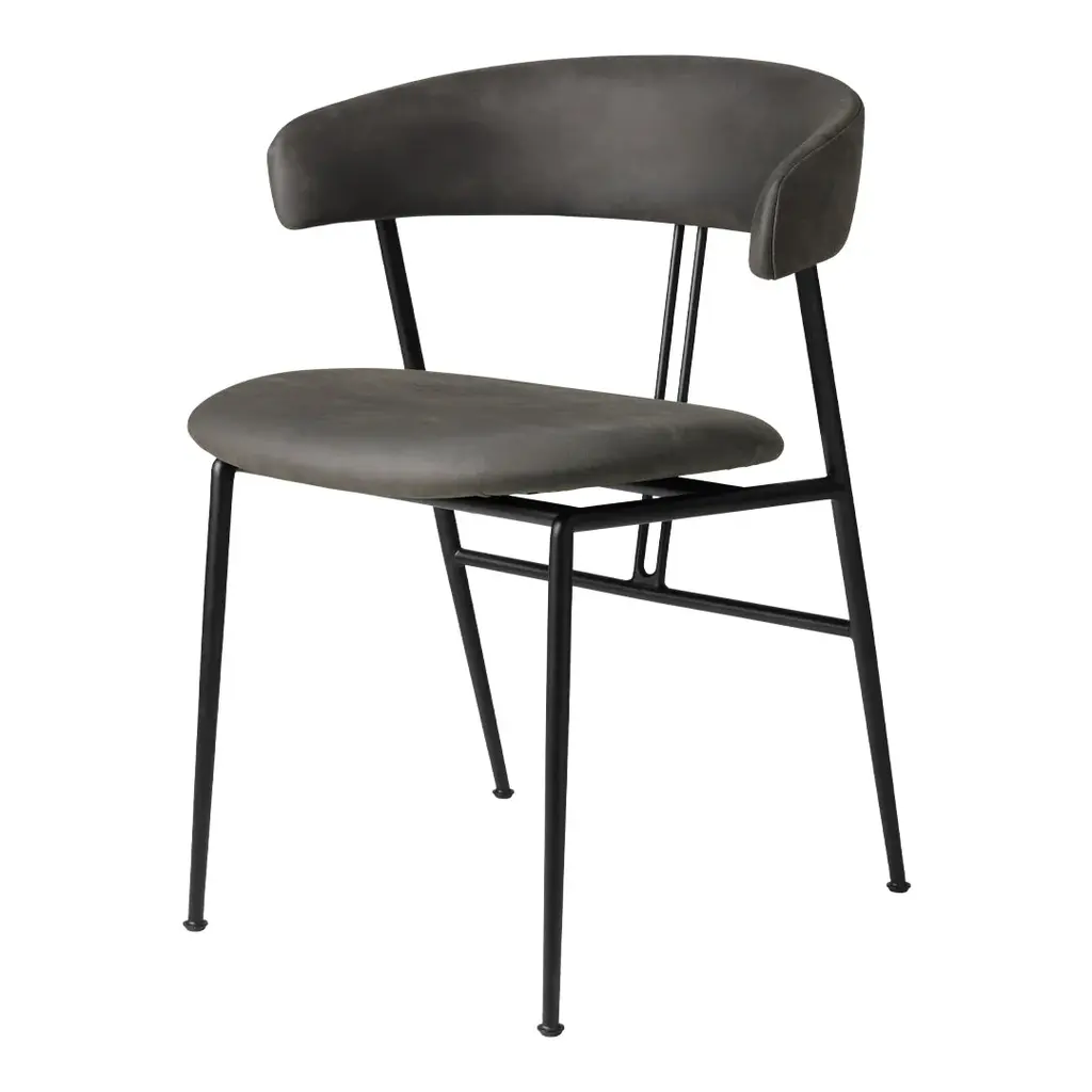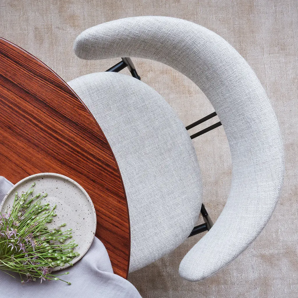 In designing the Violin Chair, GamFratesi set out to distil the archetypal form of a chair into its purest representation, without losing the sense of character for which they have become renowned. The name references the two parallel lines that extend from the backrest to a horizontal bar below the seat, evoking two parallel strings on a violin. It was these two lines, in the form of two pencil marks on the very earliest sketch, that provided the initial spark of inspiration for the design. The musicality of the name resonates with a chair that reflects a musical instrument in its geometry, symmetry and craftsmanship. Details such as the gentle curves at either side of the elegant parallel bars imbue the chair with a distinctive sense of character. The craftsmanship involved in creating this branching form, without welding for mechanical fixtures, gives the Violin Chair its decorative signature as well as providing functional support for the backrest. The Violin Chairâ€s minimalist profile, especially seen from the side where the lines cross, is an updated take on modernist geometry. Available as a fully upholstered version, and as a version with an upholstered seat and an oiled oak or walnut backrest, the Violin Chair can be dialed up or down with different upholstery options. The elegantly tapered legs of the powder-coated steel frame support a generous rounded seat and an embracing backrest that extends to partially support the forearm, elbow, or hands as an occasional armrest. This dual functionality makes the Violin Chair the perfect hybrid of dining chair and armchair. It allows you to easily twist around to speak to the person sitting next to you at dinner, while still remaining comfortable long after dessert and coffee are served.