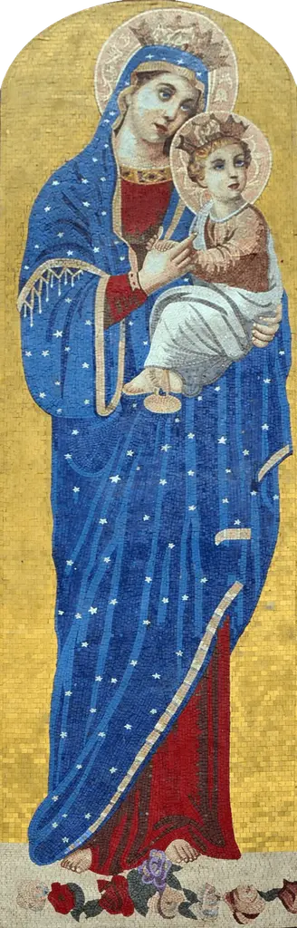 Discover the beauty of devotion with our exquisite Virgin Mary & the Sacred Heart of Jesus - Mosaic Art. This stunning, handcrafted masterpiece combines luxurious marble and vibrant glass stones to create a radiant depiction of the Virgin Mary, whose hand gracefully rests by her chest holding the Sacred Heart of Jesus—an enduring symbol of deep faith and love. This mosaic is more than decoration; it is a powerful representation of spirituality, designed to inspire contemplation and reverence in churches, sacred spaces, or your personal sanctuary. The intricate design invites a profound connection with faith, while the melding of natural stone and glass ensures premium quality and lasting durability, allowing this exquisite work to be cherished for generations. Among the exotic materials featured, the rare Blue Bahia and Blue Macaubas stones lend oceanic brilliance and sapphire-like depth with their exotic Brazilian blue and vibrant cerulean veining, evoking tropical blue luxury and electric radiance. Complementing these are the luminous, crystalline quartz stones—Prisma Yellow, Orange, Dark Red, Prisma Blue, Aqua Blue, and Light Red Quartz—each shimmering with prismatic, jewel-like translucence that enhances the mosaic’s captivating visual allure. The silky, cool-to-the-touch textures and dazzling color palette elevate this mosaic to a true luxury stone artwork. Bring this remarkable piece into your life to inspire and uplift all who enter your space. Perfect for religious gift-giving or as a majestic focal point in any sacred setting, this mosaic serves as a constant reminder of love, compassion, and faith. Embrace the beauty of devotion and invite an aura of peace and spirituality with this premium natural stone mosaic art.