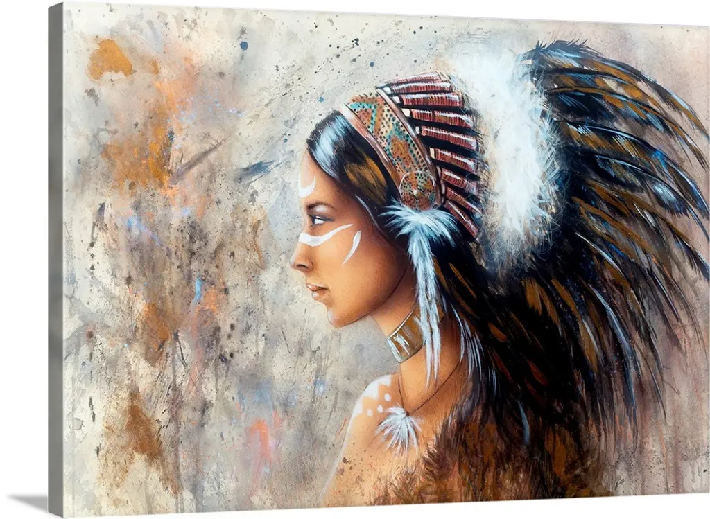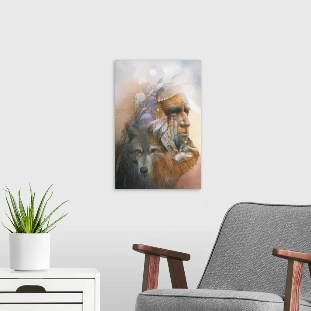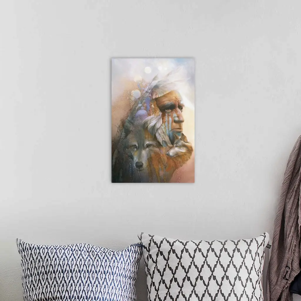 A contemporary painting of an elderly Native American man surrounded by wolves and feathers.