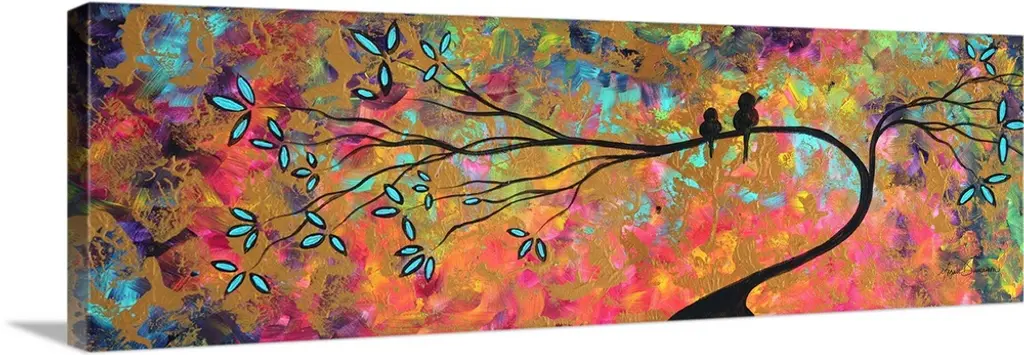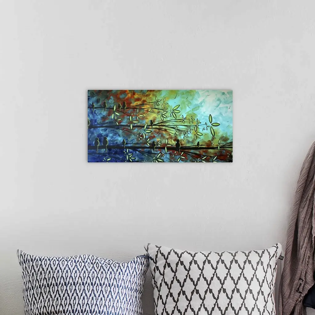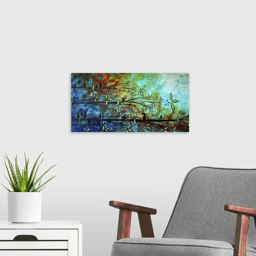 Painting of several bird silhouettes and branches on a bright brushstroke background.