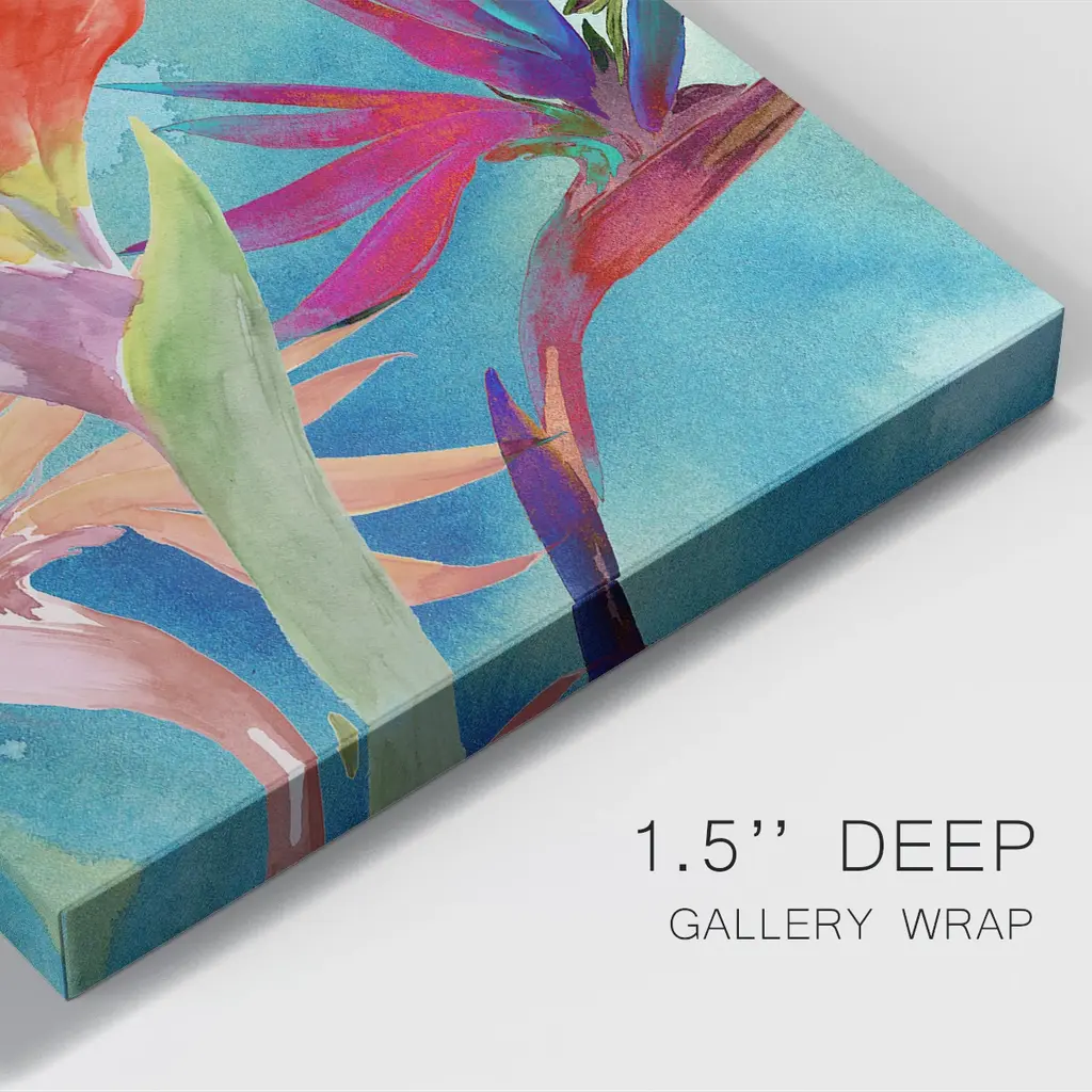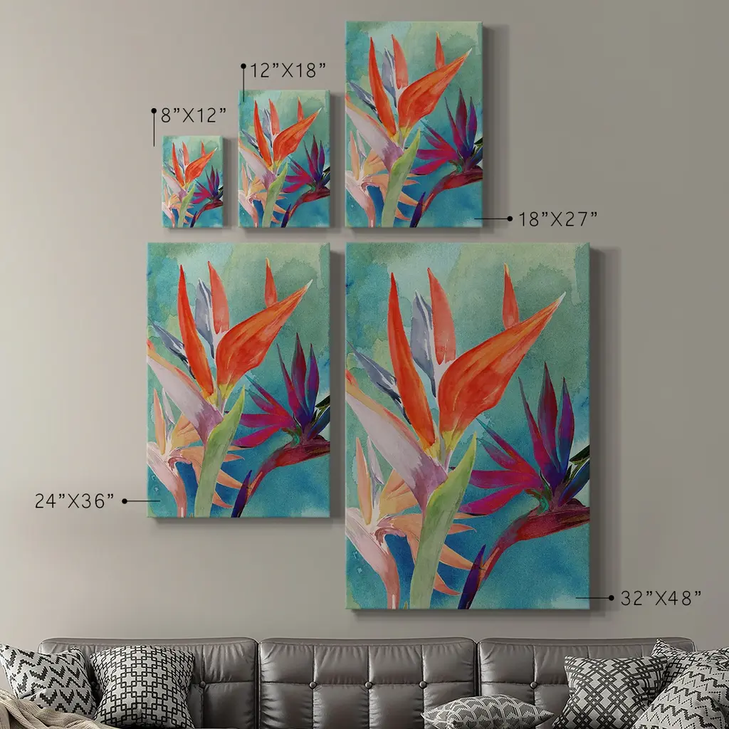 Vivid Birds of Paradise I Premium Gallery Wrapped Canvas - Ready to Hang A premium hand stretched gallery wrapped canvas print created to last. Featuring a beveled a solid wood stretcher bar, each piece comes ready to hand 6 SIZES AVAILABLE 8''X12'' - Overall Size 12''X18'' - Overall Size 18''X27'' - Overall Size 24''x36'' - Overall Size 32''x48'' - Overall Size 40''x60'' - Overall Size Each piece is made to order. Built to Last Each piece comes ready to hang Solid wood stretcher Fade and Water resistant Made domestically