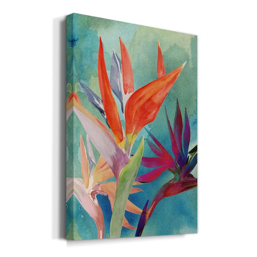 Vivid Birds of Paradise I Premium Gallery Wrapped Canvas - Ready to Hang A premium hand stretched gallery wrapped canvas print created to last. Featuring a beveled a solid wood stretcher bar, each piece comes ready to hand 6 SIZES AVAILABLE 8''X12'' - Overall Size 12''X18'' - Overall Size 18''X27'' - Overall Size 24''x36'' - Overall Size 32''x48'' - Overall Size 40''x60'' - Overall Size Each piece is made to order. Built to Last Each piece comes ready to hang Solid wood stretcher Fade and Water resistant Made domestically