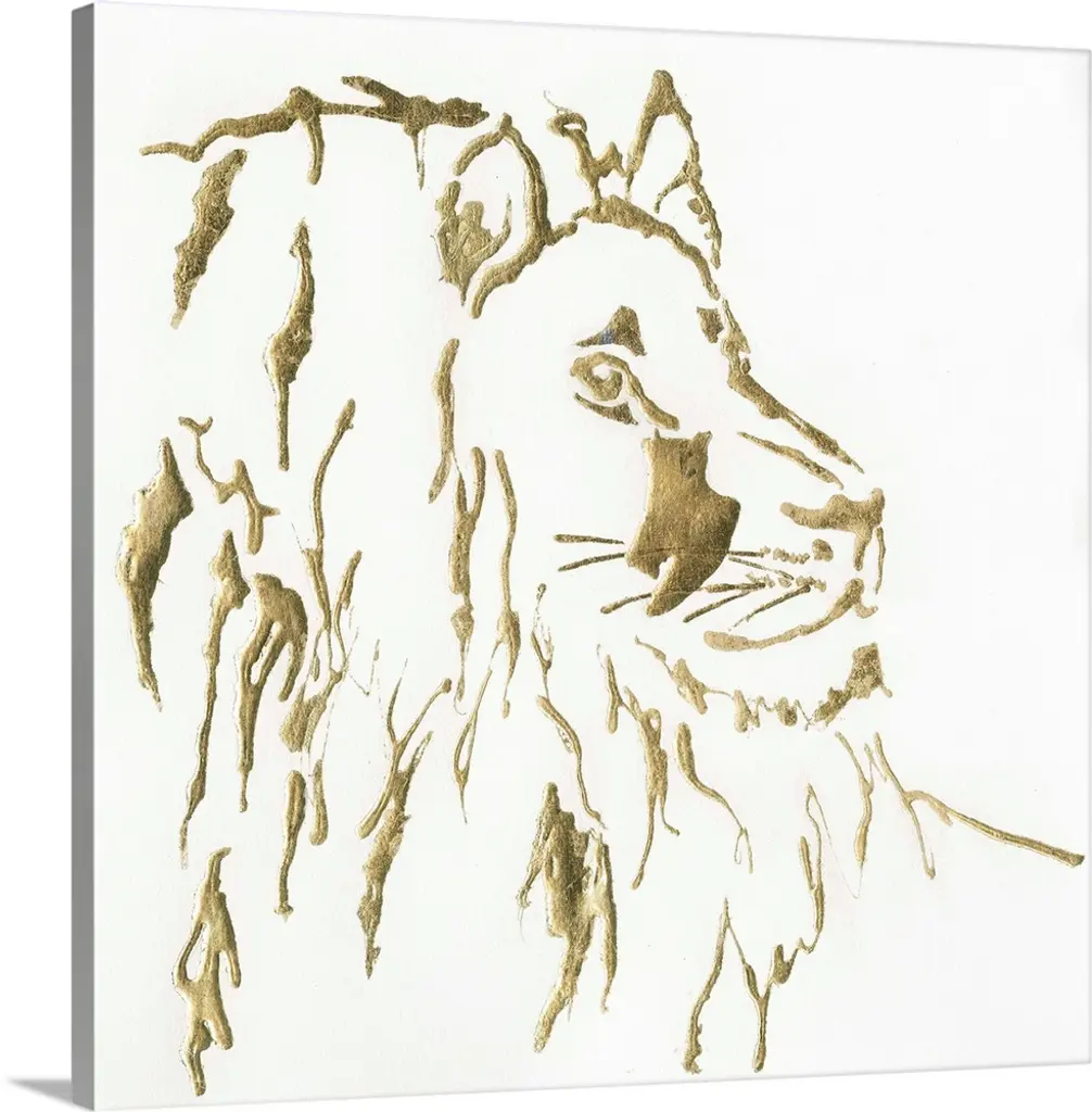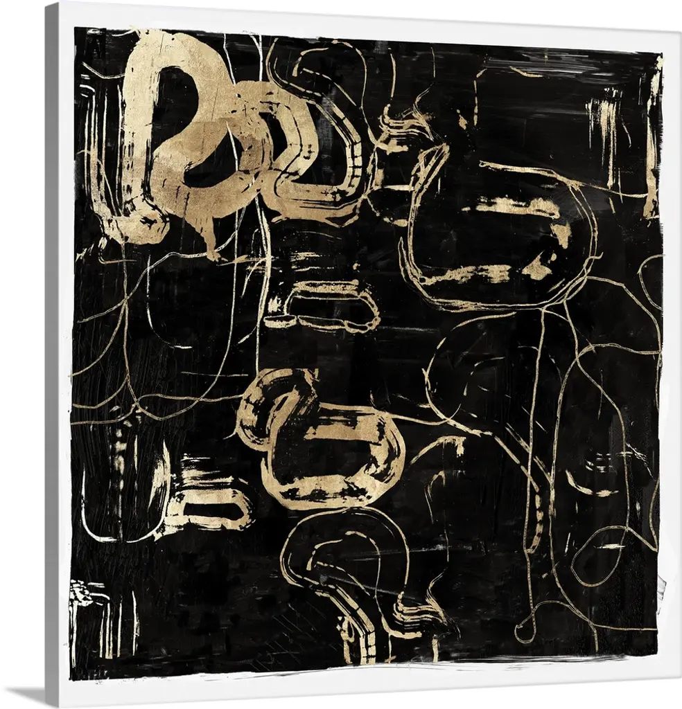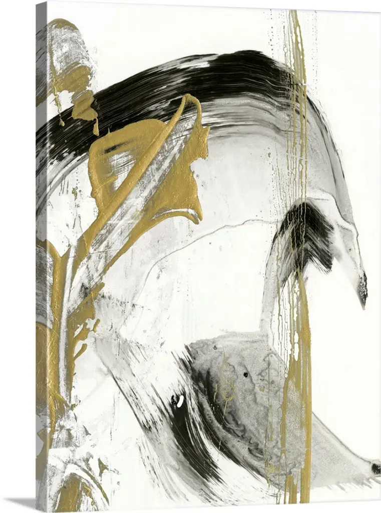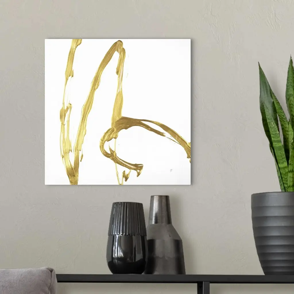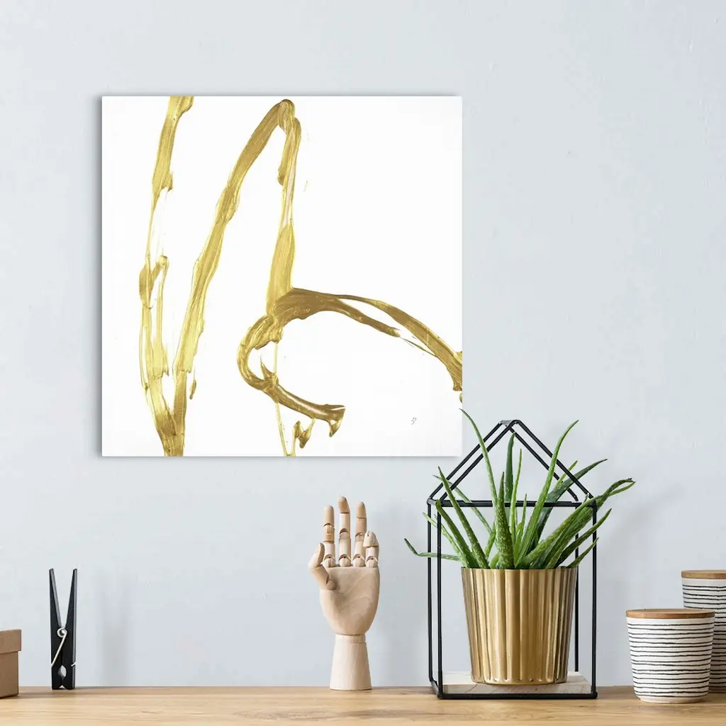 Square minimalist abstract artwork with metallic gold brushstrokes on a white background.