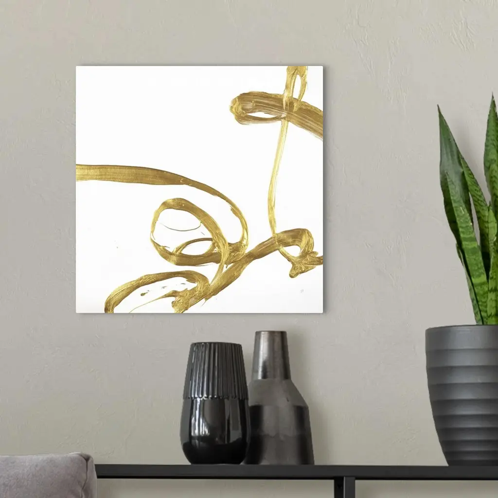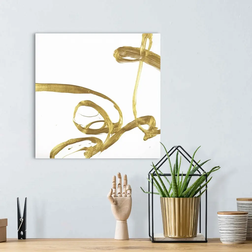 Square minimalist abstract artwork with metallic gold brushstrokes on a white background.