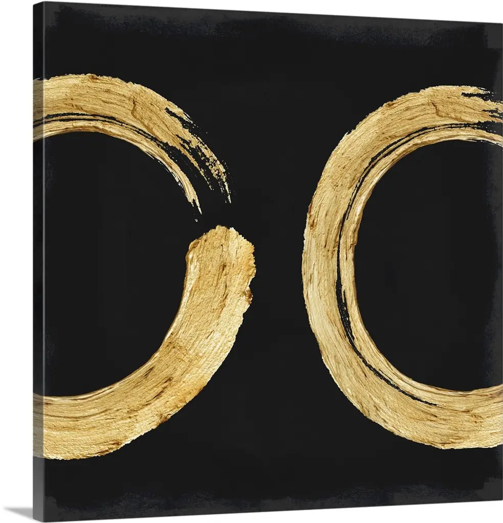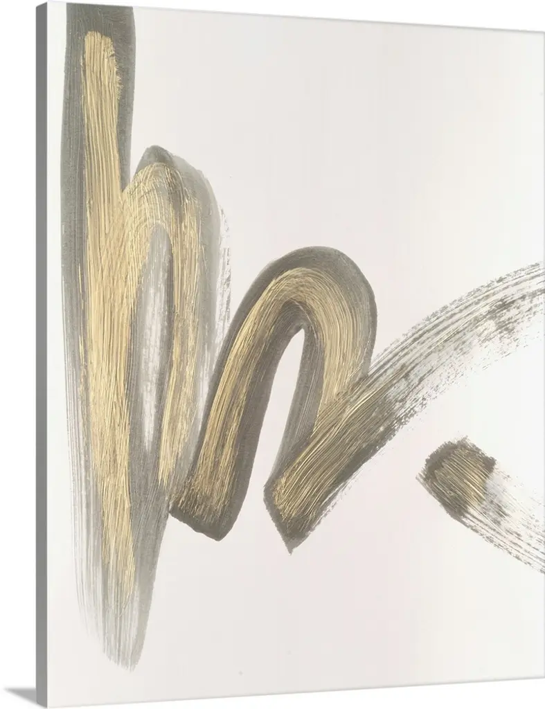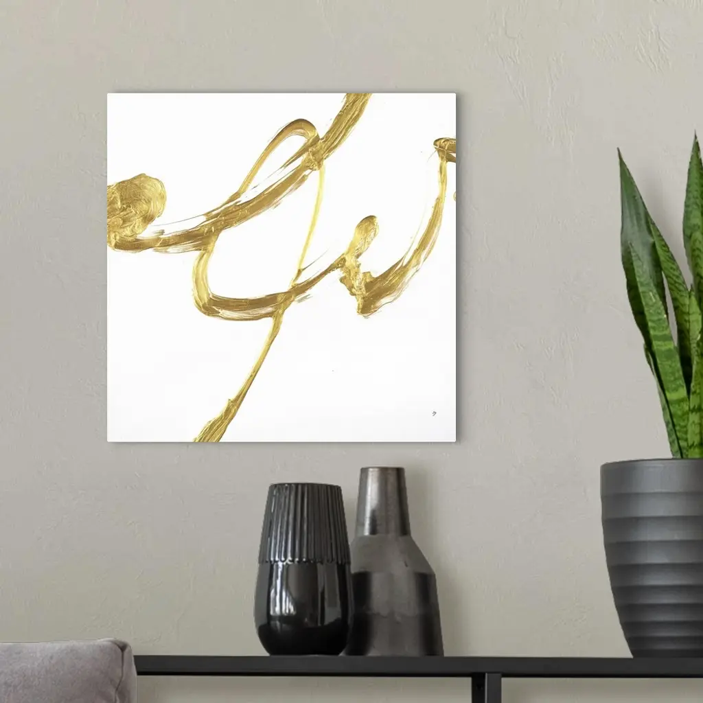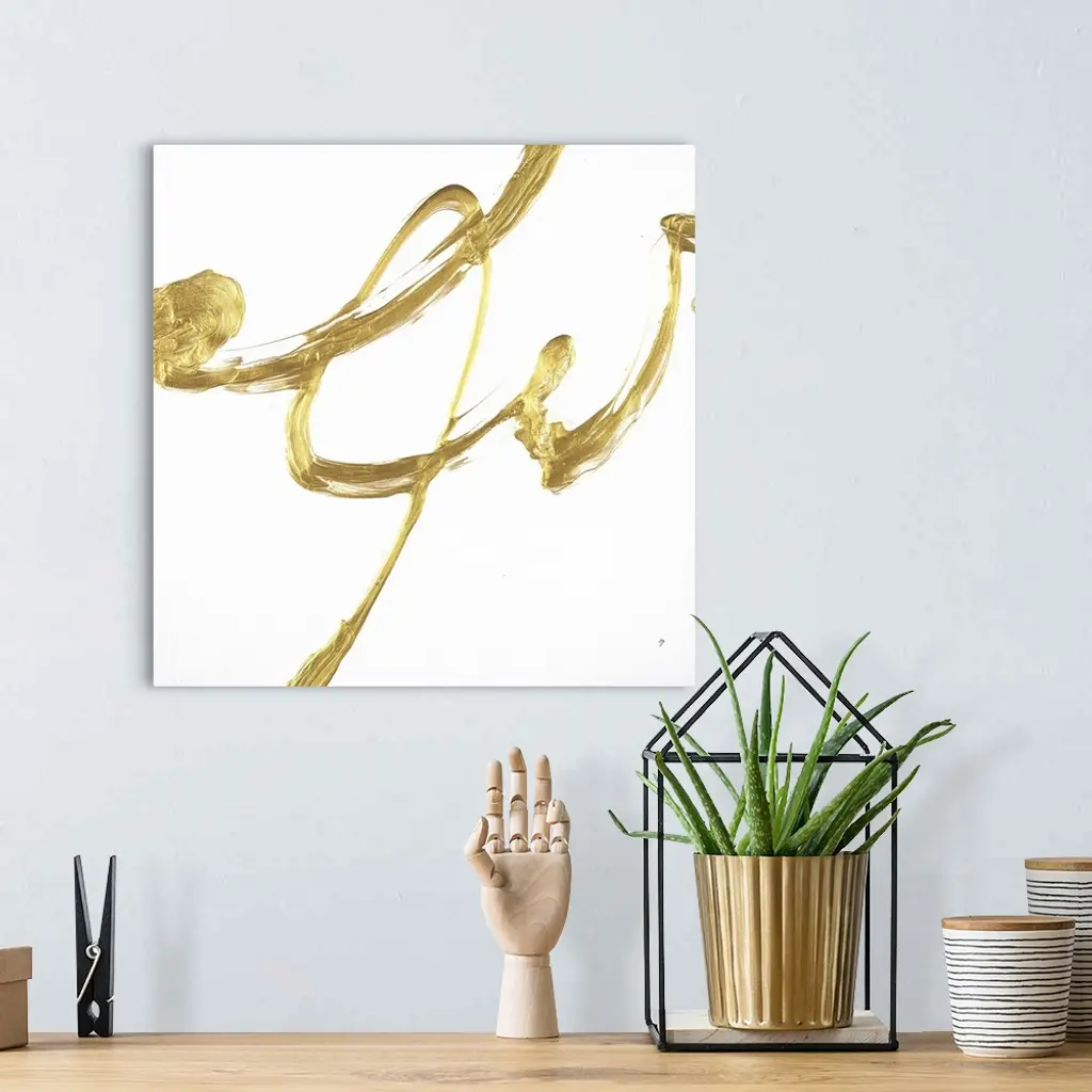 Square minimalist abstract artwork with metallic gold brushstrokes on a white background.