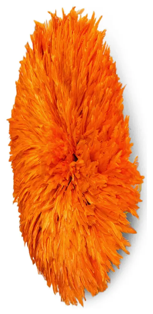 Beautiful hand crafted original JuJu hat wall art. Vibrant orange feathers. These attractive bird feather art form were originally worn as a headdress by dignitaries, chiefs, and the royal families also wear these ceremonial hats as a symbol of prosperity and wealth. Created from woven natural or brightly colored dyed wild chicken feathers then tied to straps and pulled open into a stunning circular display.