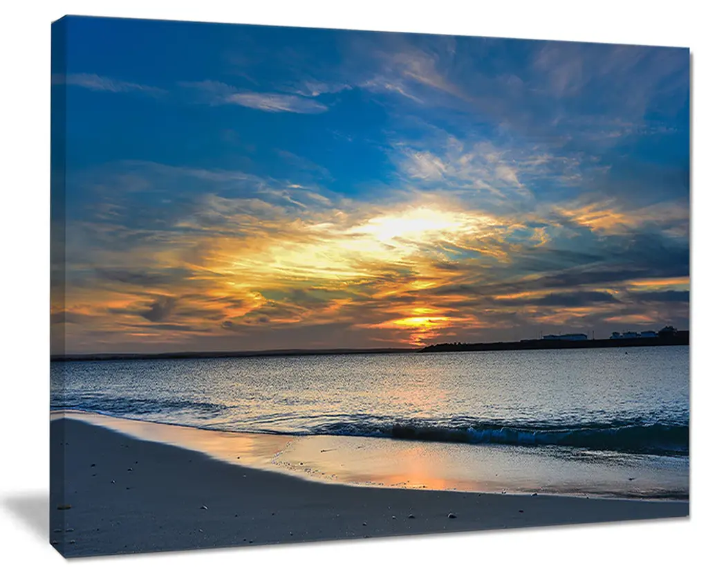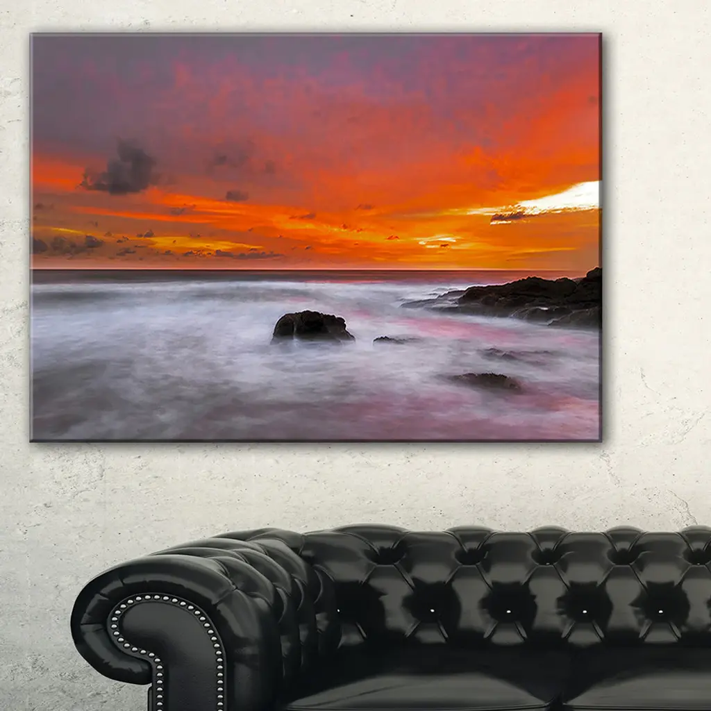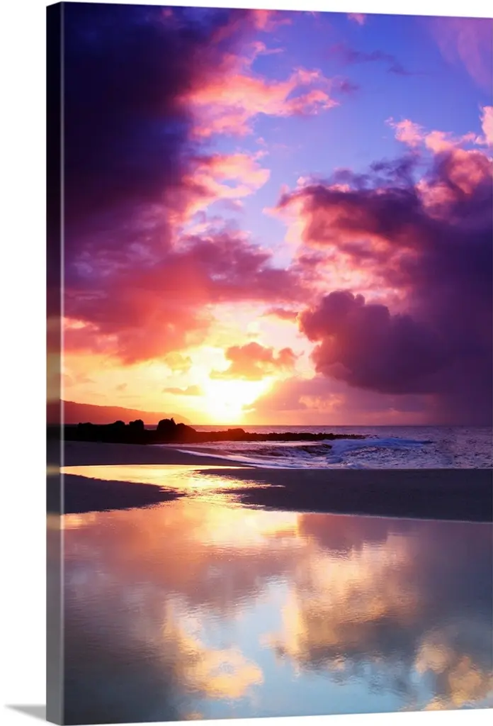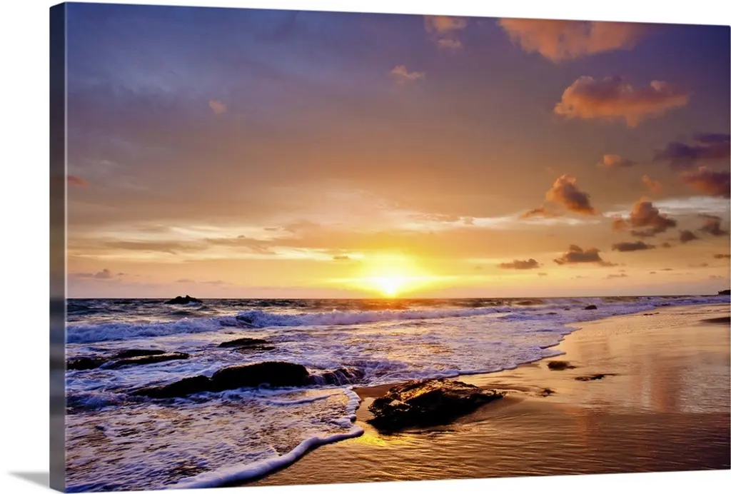 The Vividly Colorful Tropical Beach at Sunset canvas art print is sure to make an impression on anyone who sees it. This artwork is gallery wrapped around a 1-inch solid wood frame and arrives carefully packaged and entirely ready to hang on the wall. Design Art only uses the highest resolution and pigments to ensure a crisp colorful print that is never faded or pixelated. This artwork is sure to be a conversation starter in any home or office.