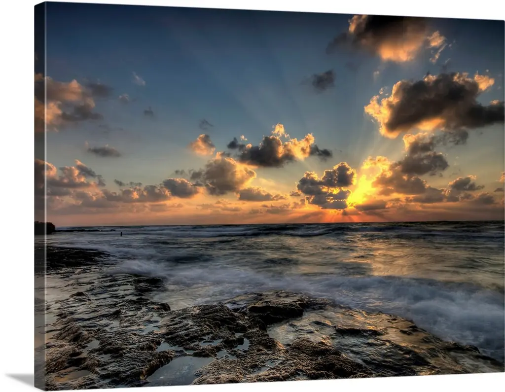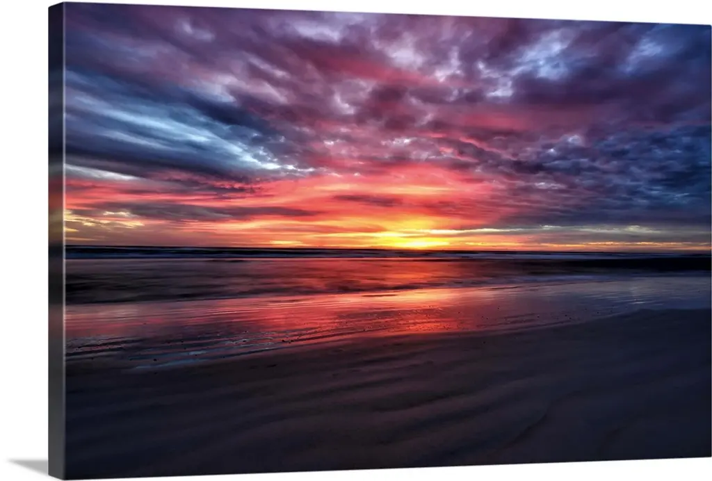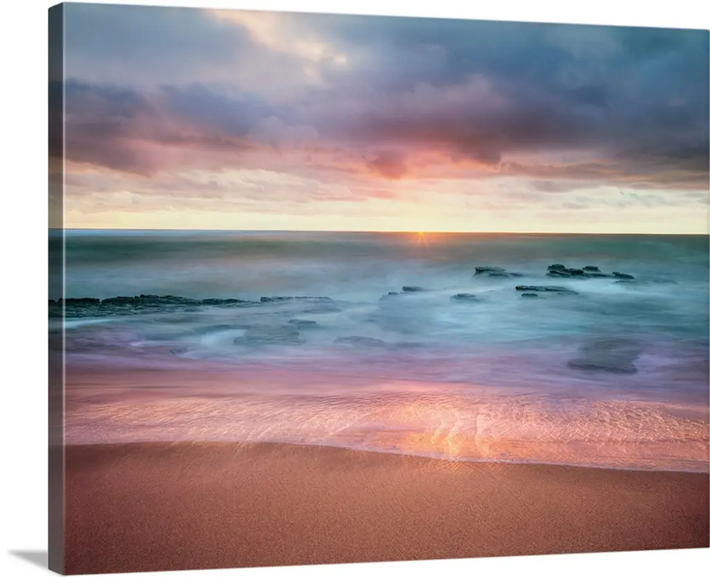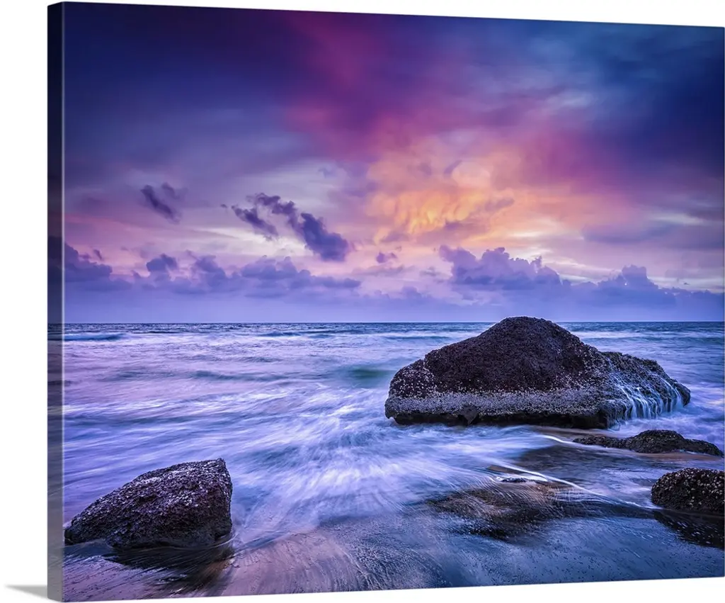 The Vividly Colorful Tropical Beach at Sunset canvas art print is sure to make an impression on anyone who sees it. This artwork is gallery wrapped around a 1-inch solid wood frame and arrives carefully packaged and entirely ready to hang on the wall. Design Art only uses the highest resolution and pigments to ensure a crisp colorful print that is never faded or pixelated. This artwork is sure to be a conversation starter in any home or office.