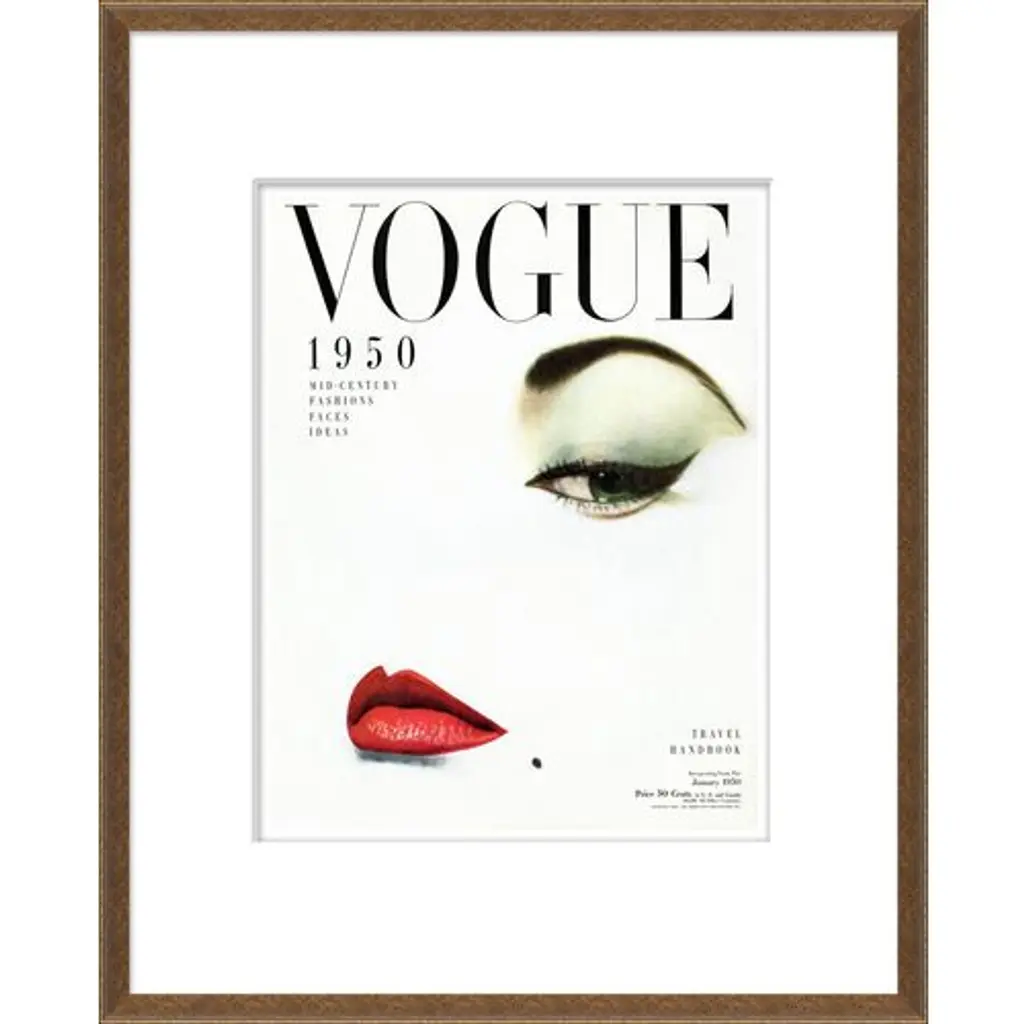 Seen first at One Kings Lane: A faithful reproduction of a vintage Vogue cover, this piece is printed on archival paper, matted, and displayed under glass in a wood frame. Arrives ready to hang.