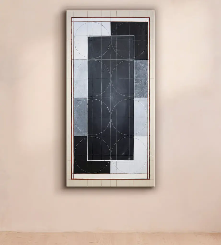 An original abstract painting created using a mix of acrylic, high-visibility vinyl and gesso on canvas.Born in Germany and based in London, Sabrina Brouwers creates artworks inspired by Sol LeWitt, a pioneering figure in the Conceptual Art movement. She challenges manmade principles by combining grid-like forms with fluid, circular shapes.