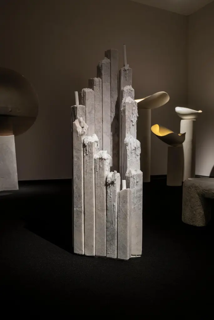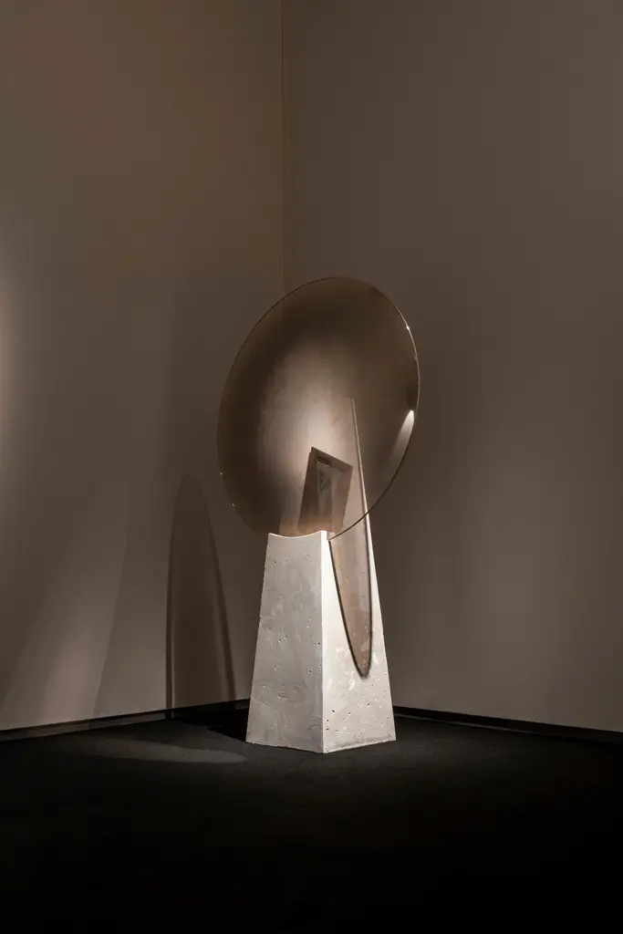 Void Floor Mirror by Boldizar SenteskiOne of a kind.Dimensions: D 40 x W 105 x H 177 cm.Materials: Silver, Glass, Casted stone.Sculptural standing mirror piece with fading-oxidized mirror and casted stone base.Growing up in Budapest, Boldizar Senteski was influenced by the eclectic environment of the city where post-soviet brutalism blends with the elements of a once prosperous monarchic era. Boldizar creates his unique and limited edition collectible design pieces by incorporating fragments from the urban landscape. He celebrates the simultaneous existence of past and future, passing and renewal, decay and flourishment. Boldizar uses alchemy and praises uncalculated errors while he lets materials shape themselves. Bridging the contrast between intentional and unintentional, traditional and progressive, craftsmanship and Industrial solutions. Boldizar started experimenting with mirroring surfaces back in University, where he was researching human perception. How we perceive ourselves and what surrounds us inspired his first Mirror Collection which resulted in his graduation work of four fading Mirror pieces using the ancient technique of silver mirror making. Since then he has been exploring the technique and shaping it to his own image where the oxidation process of the silver is highlighted and uncalculated errors and shapes are celebrated. Using alchemy, each mirror piece is a handmade creation, placing the “mirror paintings” somewhere between art and functional design.