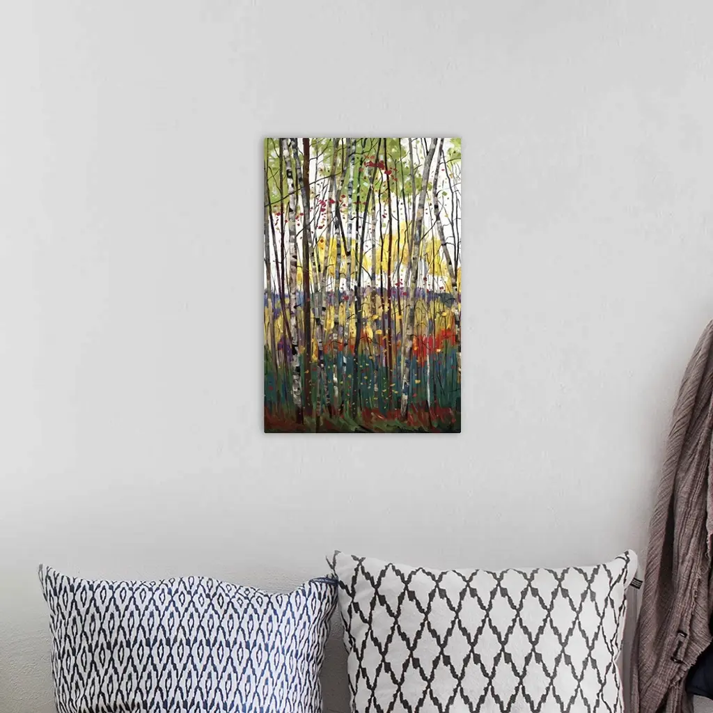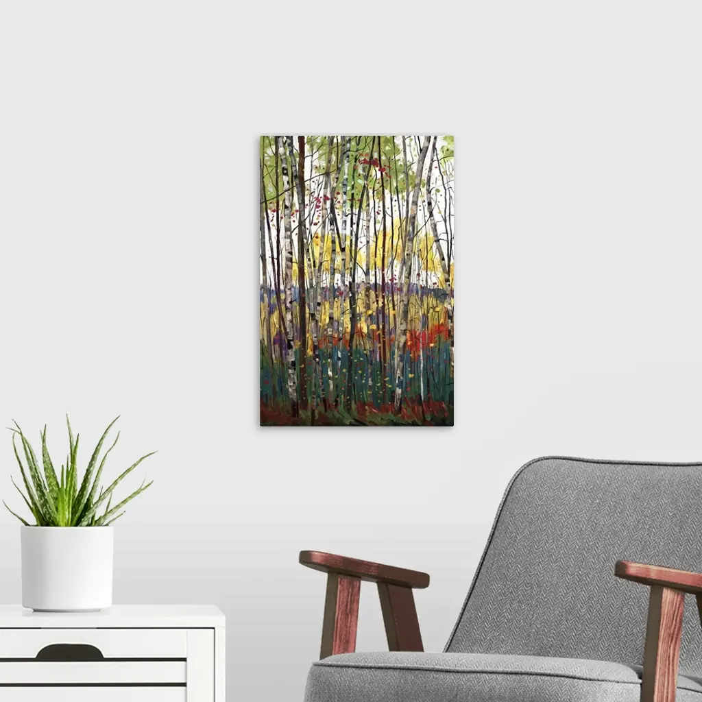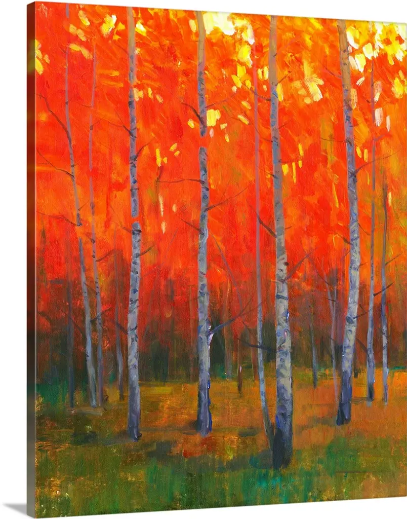 Contemporary painting of a forest full of colorful trees in tones of red, yellow and orange.
