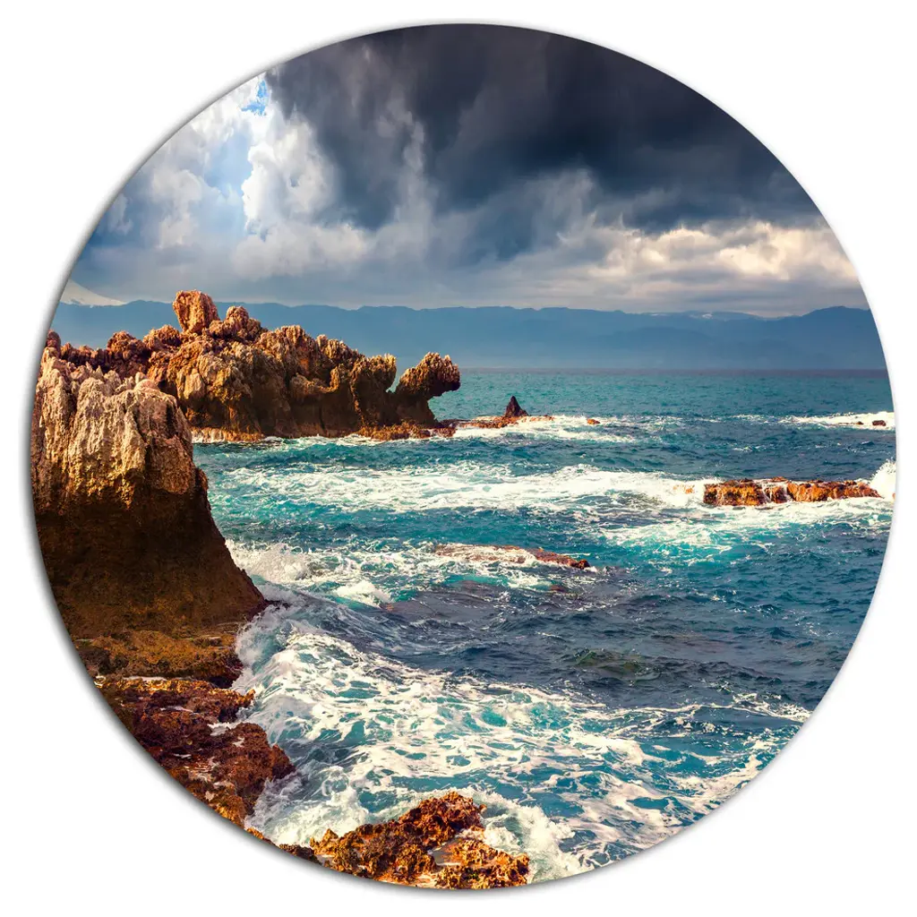 Bring Contemporary Abstraction to your home with this large Circle Metal wall art. This Volcanic Beach Stormy Weather Metal Artwork makes it the focal point of any room or office. - White Gloss Coating ensures colors are extra vibrant with light reflection.- Aluminum grade Sheet Metal with 1 inch mounting frame on the back giving the illusion that the artwork is floating on the wall..- Mounting Brackets are included along with instructions.- High Quality Digital images are created directly into a glossy aluminum panel producing a stunning and captivating print into the glossy finish of the metal.- Water, Fire and Scratch resistant HD Aluminum panels.- Looks better than any photo paper and guaranteed to last at least 20 years- Easy to clean with a microfiber cloth. Colors are far superior to regular Canvas Art. - Easy to Hang