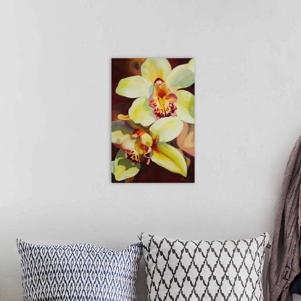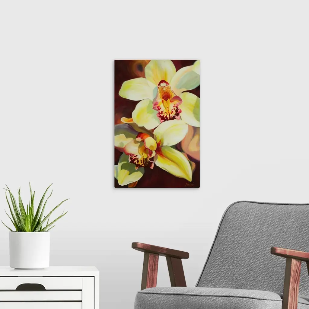 Voracity is a big flower painting of creamy yellow orchids with rich wine burgundy markings sitting on a deep burgundy background.