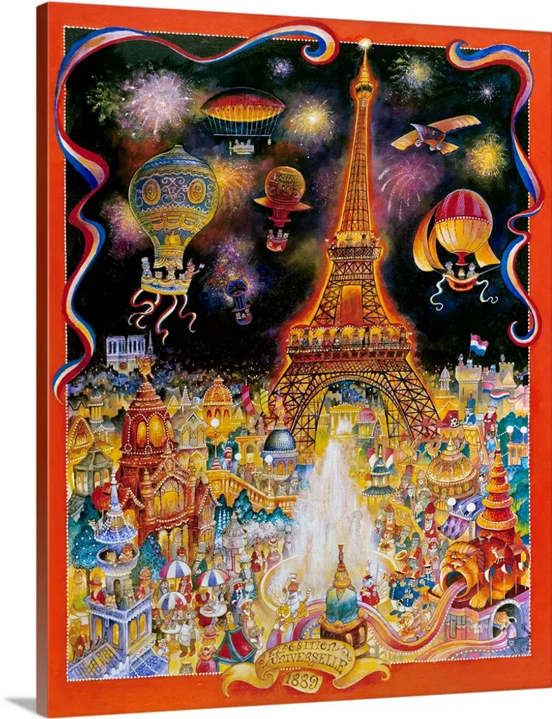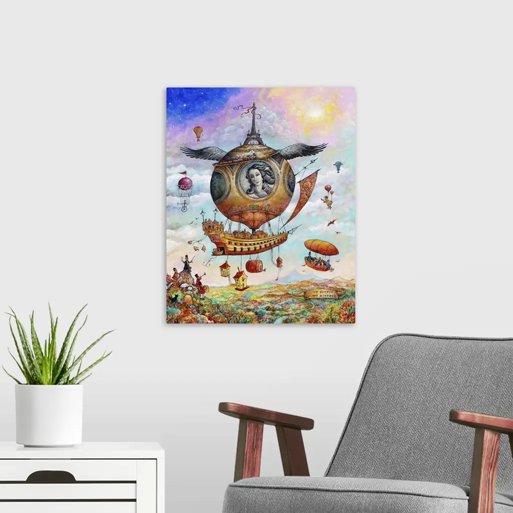 A painting of a scene of airships flying over a valley.