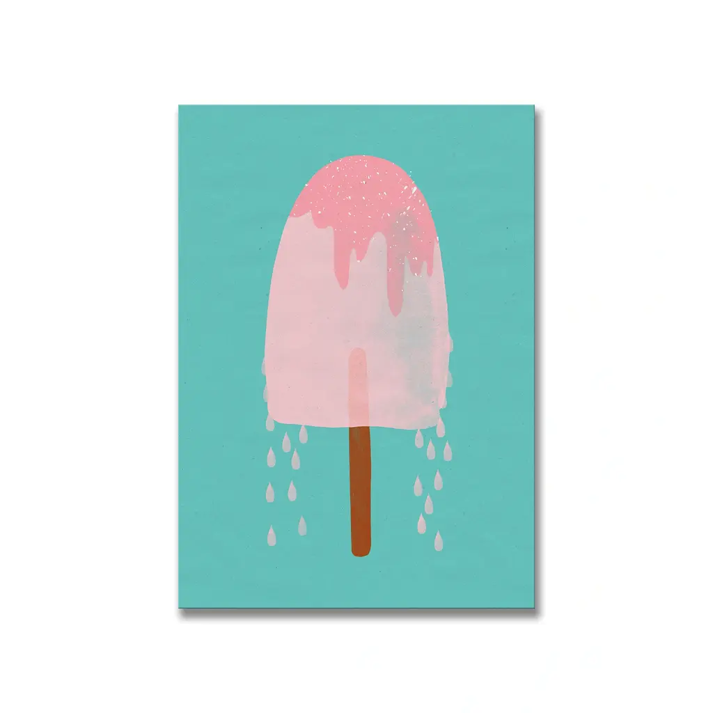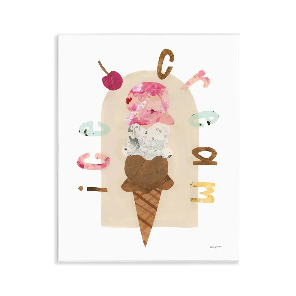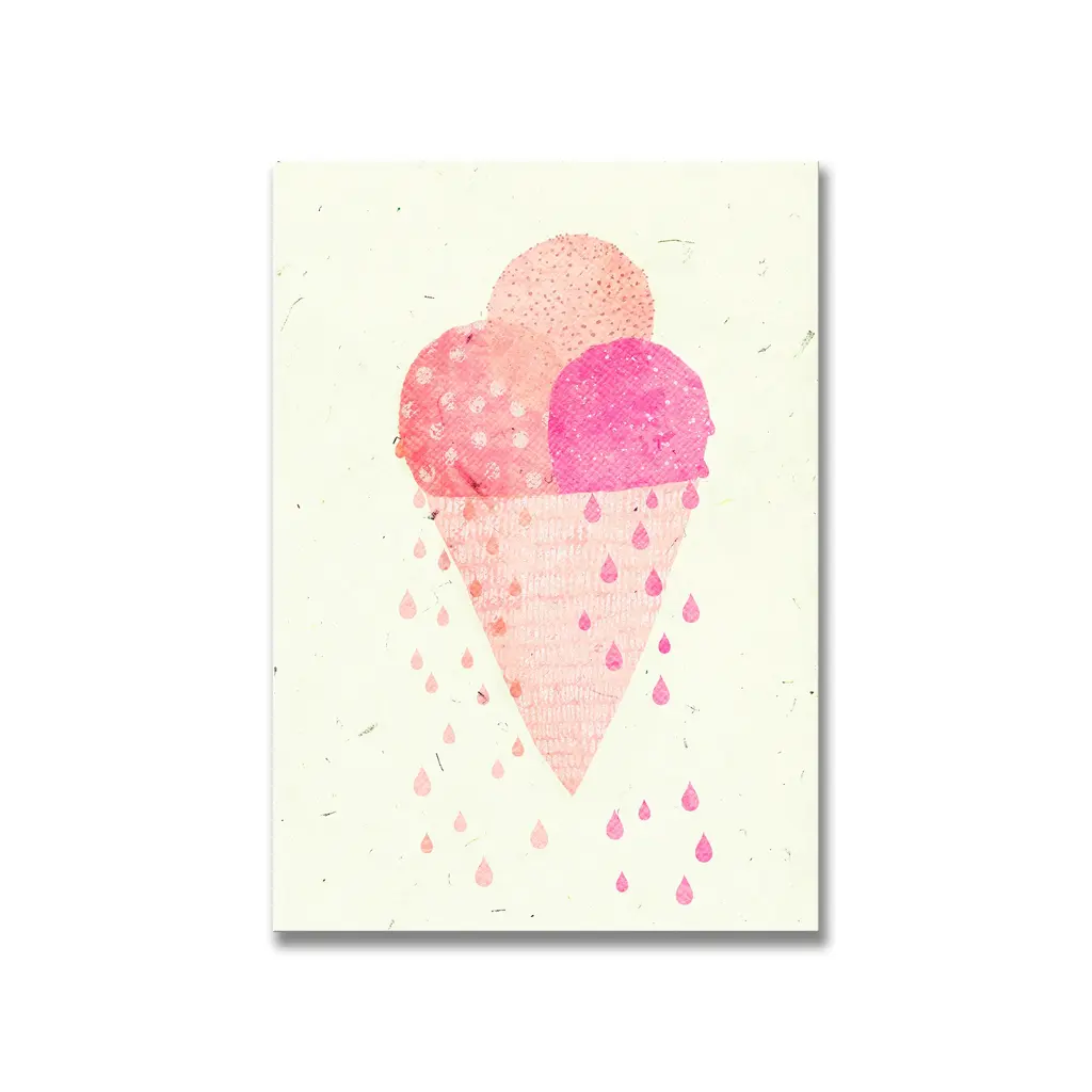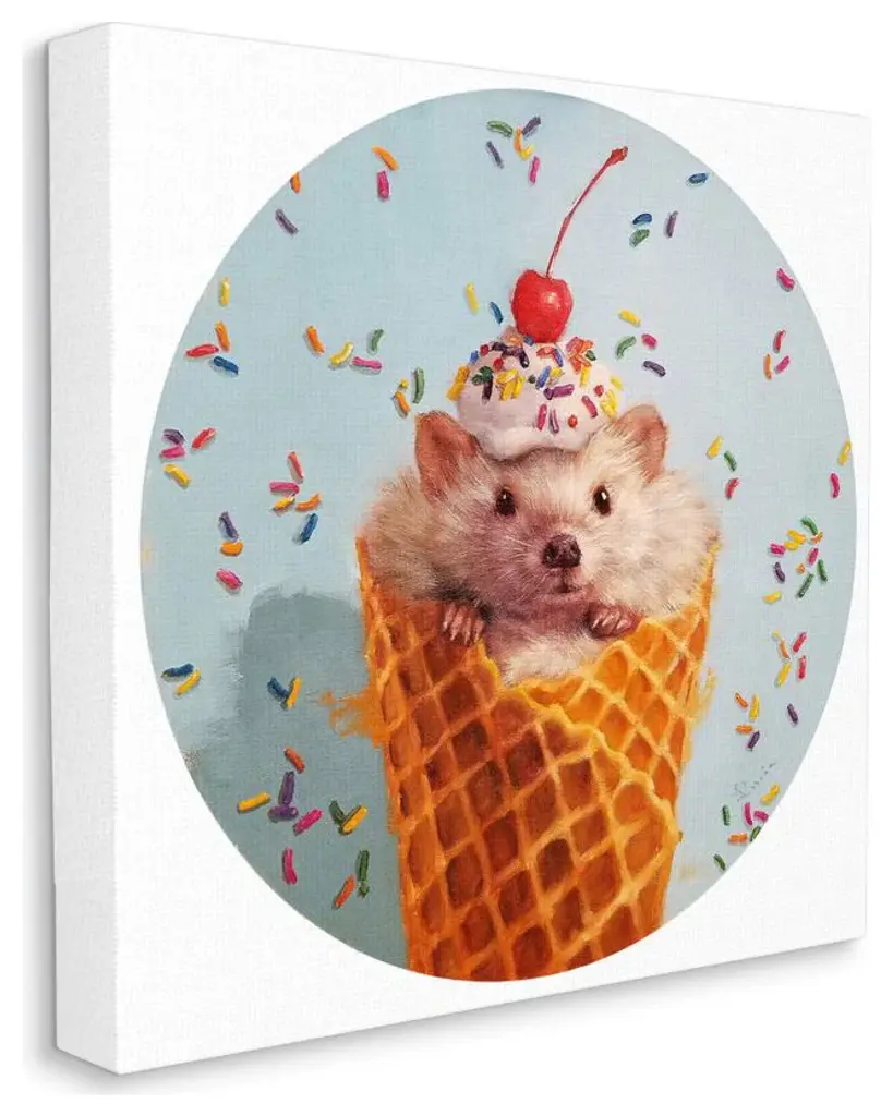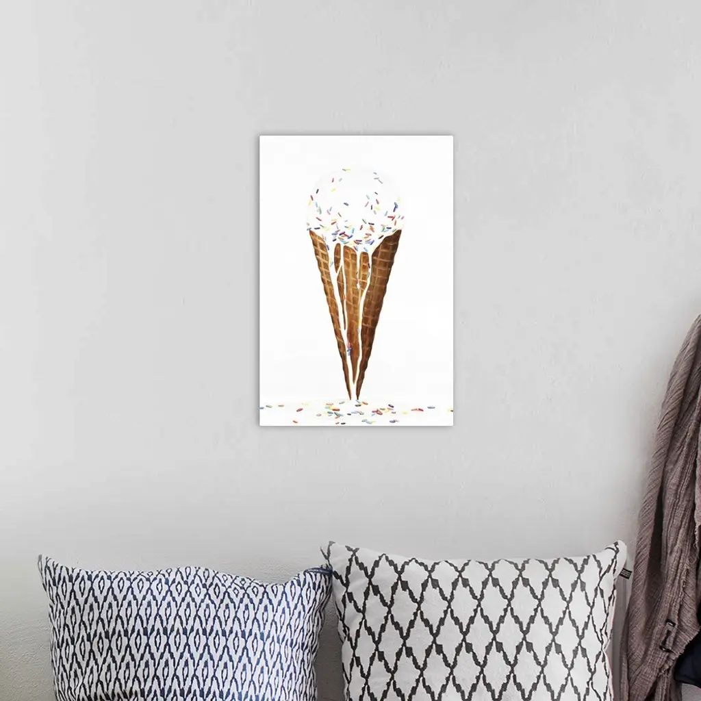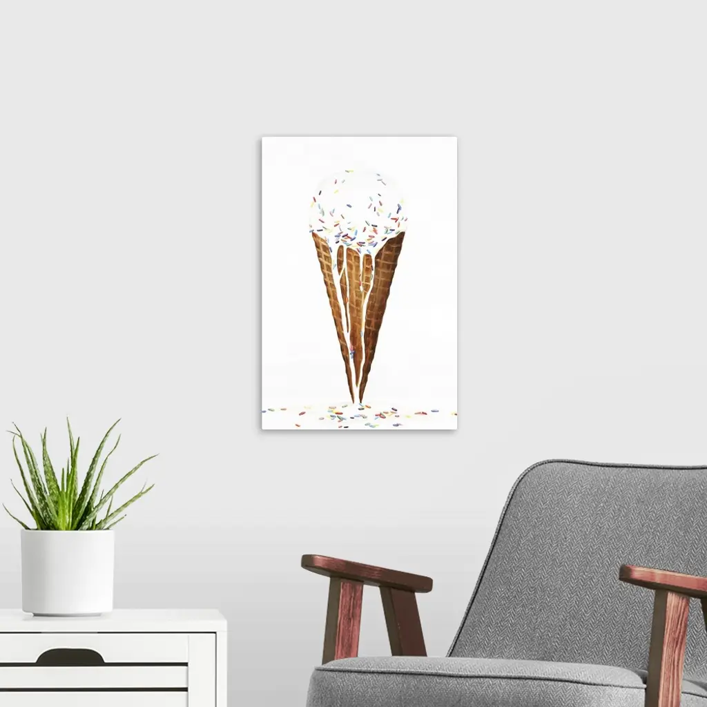 Contemporary painting of vanilla ice cream with sprinkles, melting over a waffle cone and onto the bottom of the canvas.