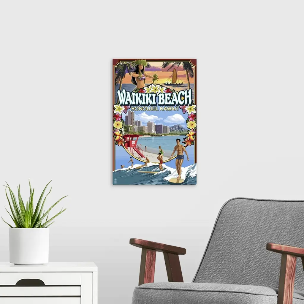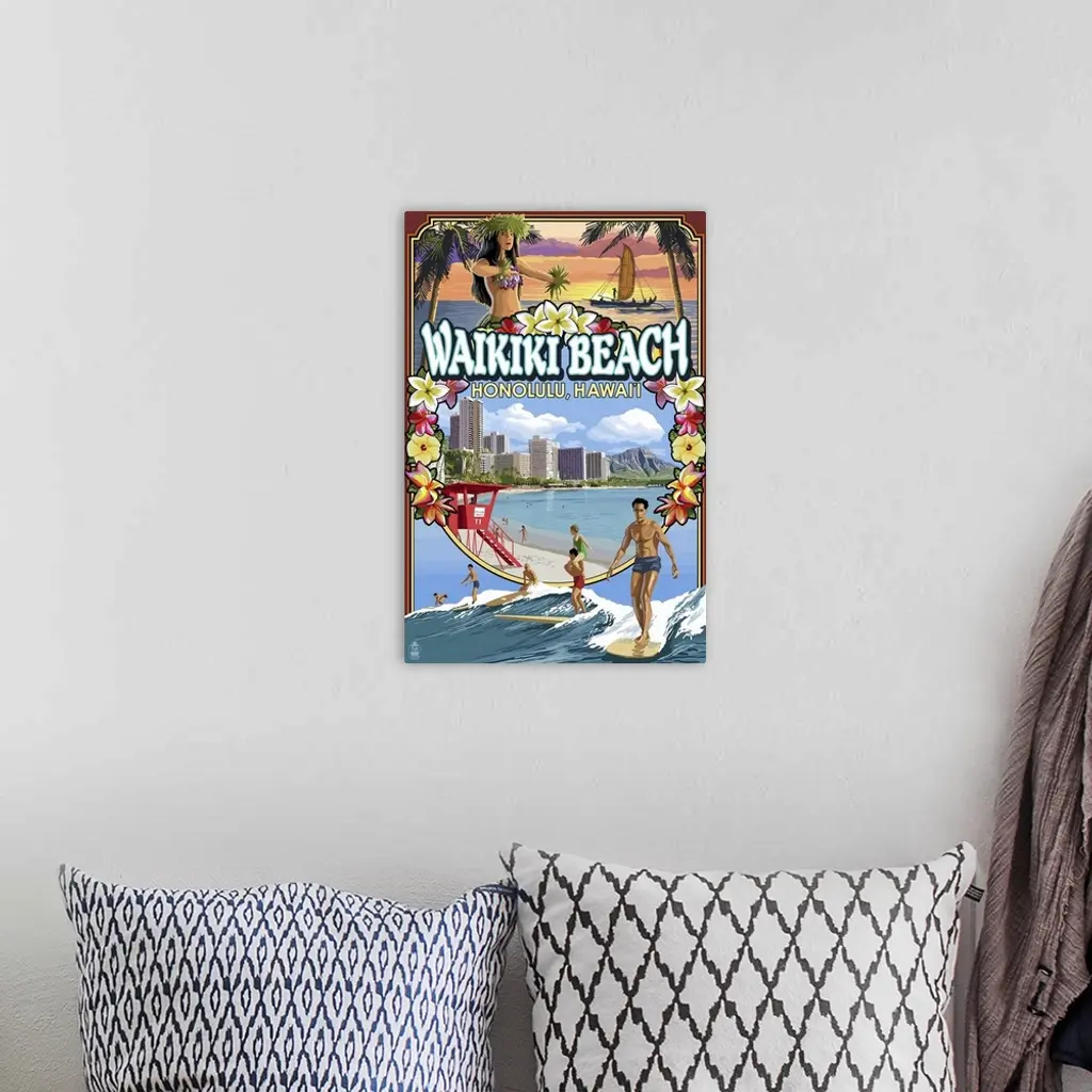 Waikiki Beach, Oahu, Hawaii - Scenes: Retro Travel Poster wall art for home and office decor. Discover canvas art prints, photos, mural, big canvas art and framed wall art in GreatBigCanvas.com's varied collections.
