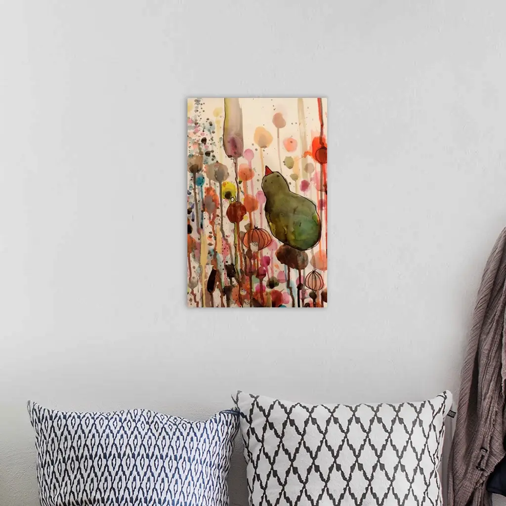 Colorful contemporary watercolor painting of a bird perched on a branch against a colorful background.