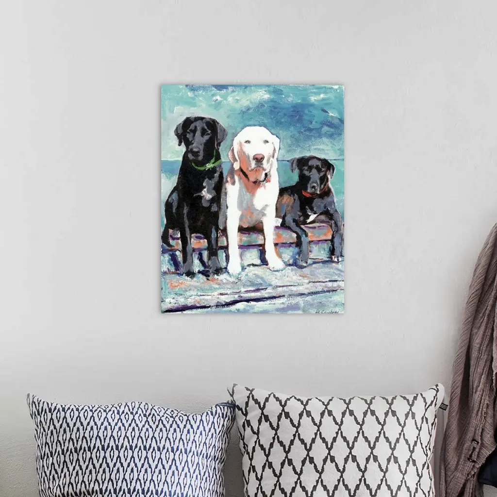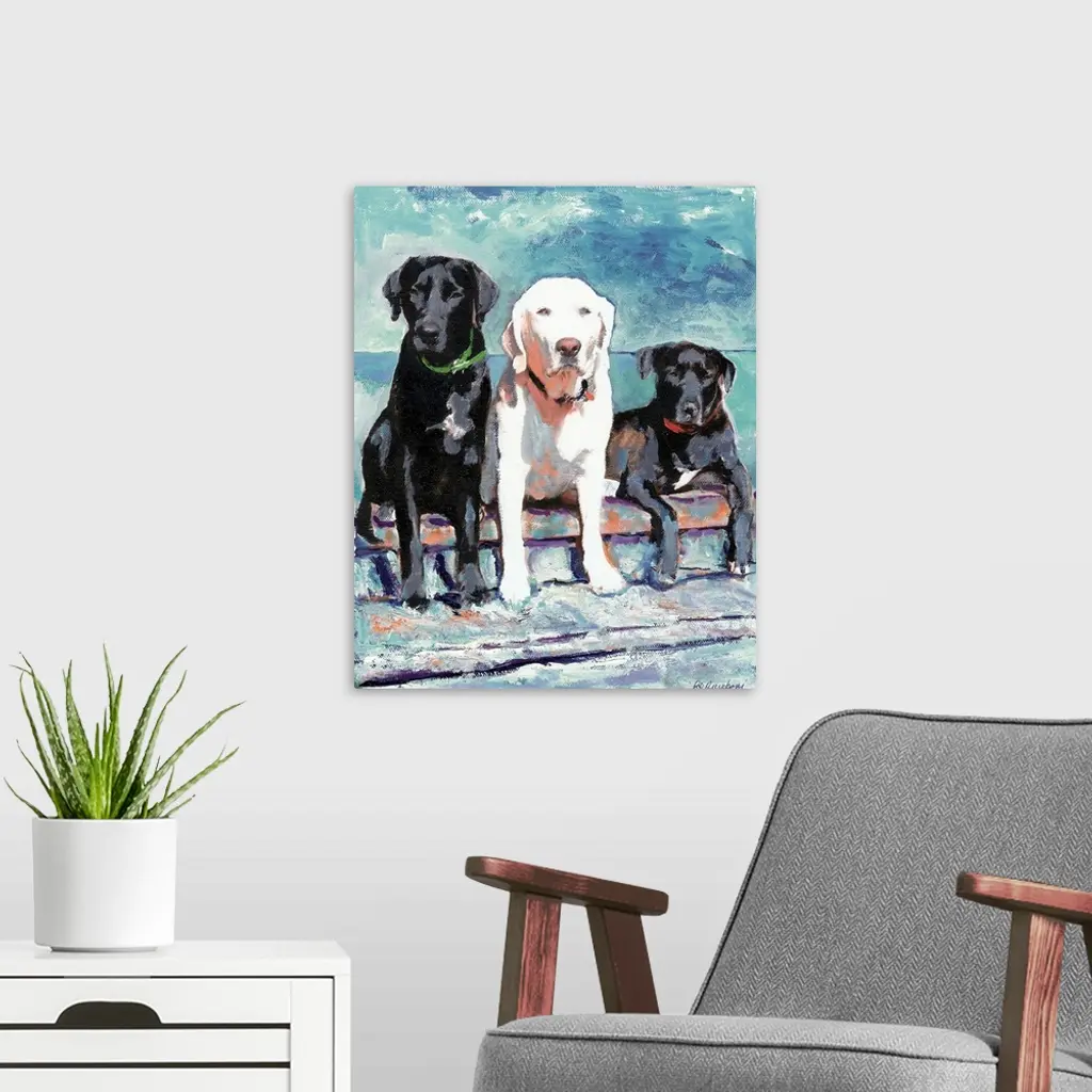Contemporary painting of three Labradors, two black and one white.
