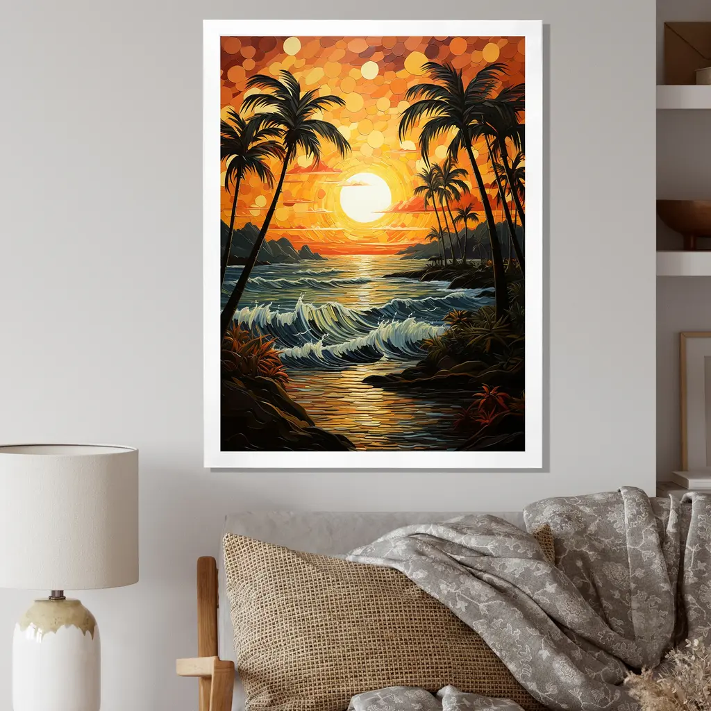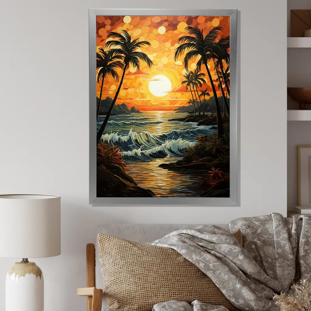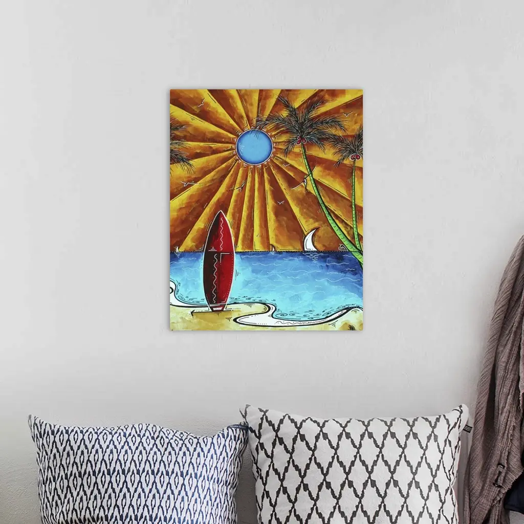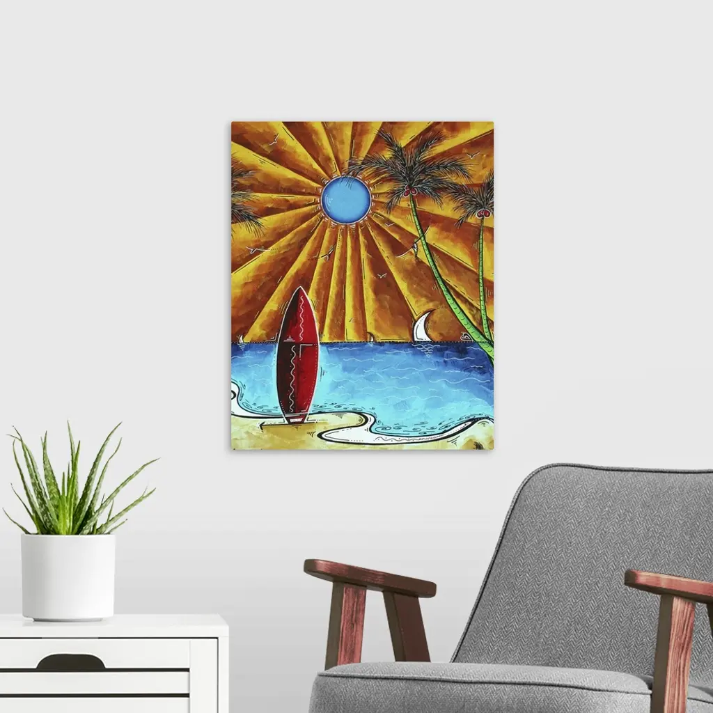 This Original and Sophisticated Whimsical Surf Painting is in MADART's Signature Style, a style of painting with unique design elements throughout the art. The burnt orange rays of the deep aqua blue sun compliment the bold turquoise and aqua of the shimmering water. ?The lone red surfboard waits for the waves to roll in while red and yellow starfish and bold green palm trees dot the foreground with splashes of color. If you love tropical surf art this is a statement piece for you! It is bold, colorful, whimsical and will be an instant conversation piece in your home.�