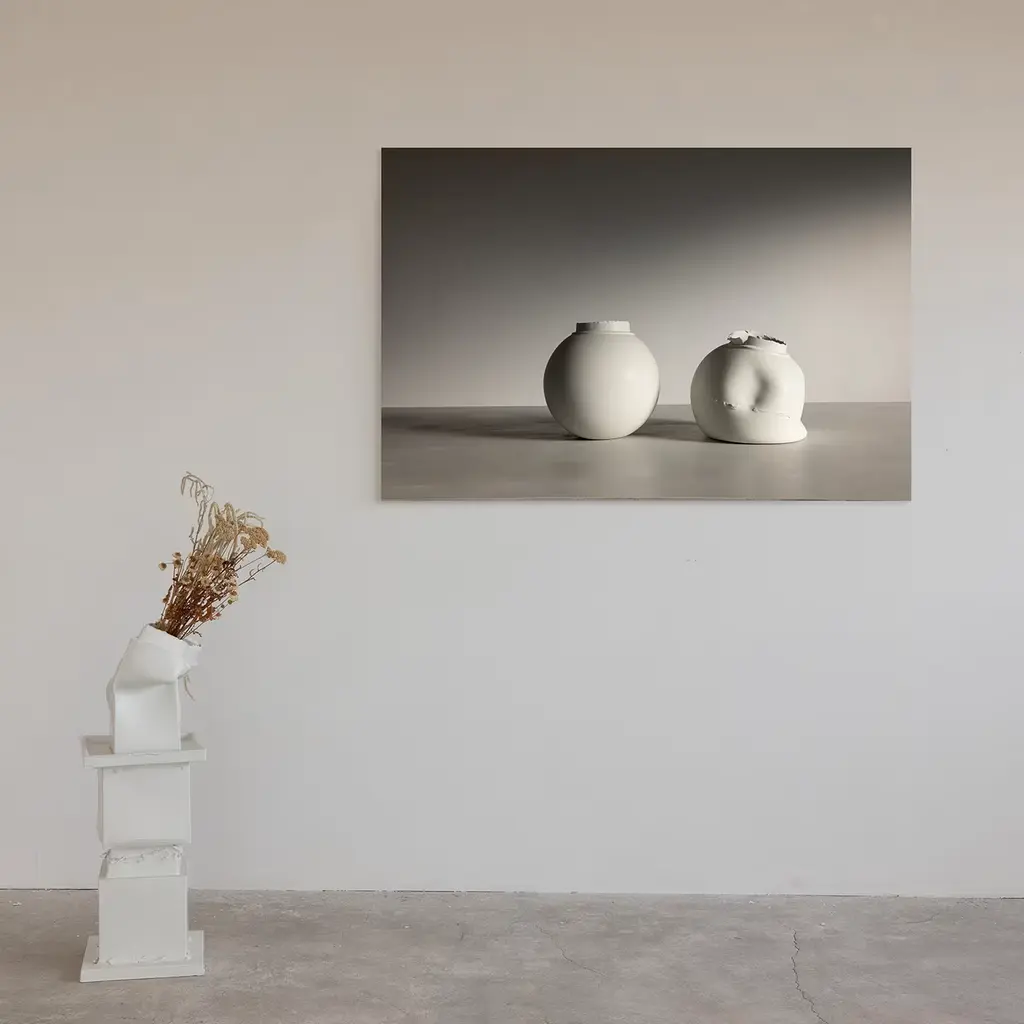 "Waiting in Cassola" is a captivating pigment print photograph of white ceramic vases, printed on Fine Art paper and mounted on dibond. Sold unframed, it includes a Certificate of Authenticity, ensuring its provenance. Part of the 'Break the Mold' project, this piece critiques mass production while honoring Nove di Bassano, Italy, the artist's grandfather's hometown. The nearly life-size print creates the illusion of the vases emerging into physical space, making a memory tangible. The empty, lopsided vases evoke the region's abandoned ceramic factories and reflect the artist's unique ceramic style. Their asymmetry and fragility, reminiscent of Giorgio Morandi’s work, offer a poignant commentary on imperfection, craftsmanship, and impermanence.