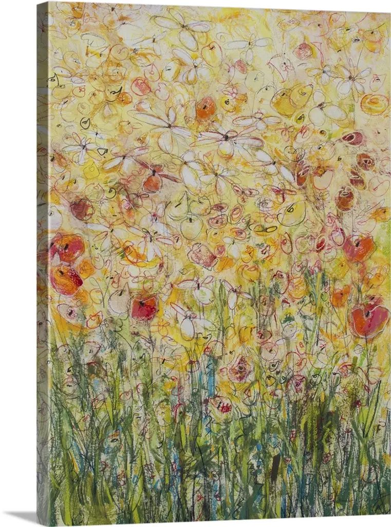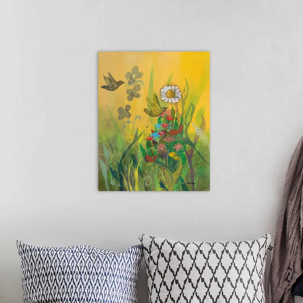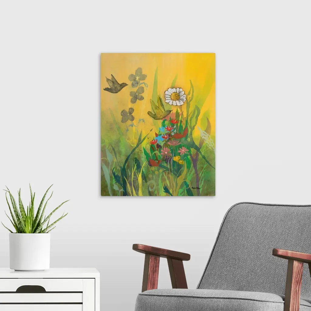 Contemporary painting of a daisy and other flowers in a garden with two small birds.