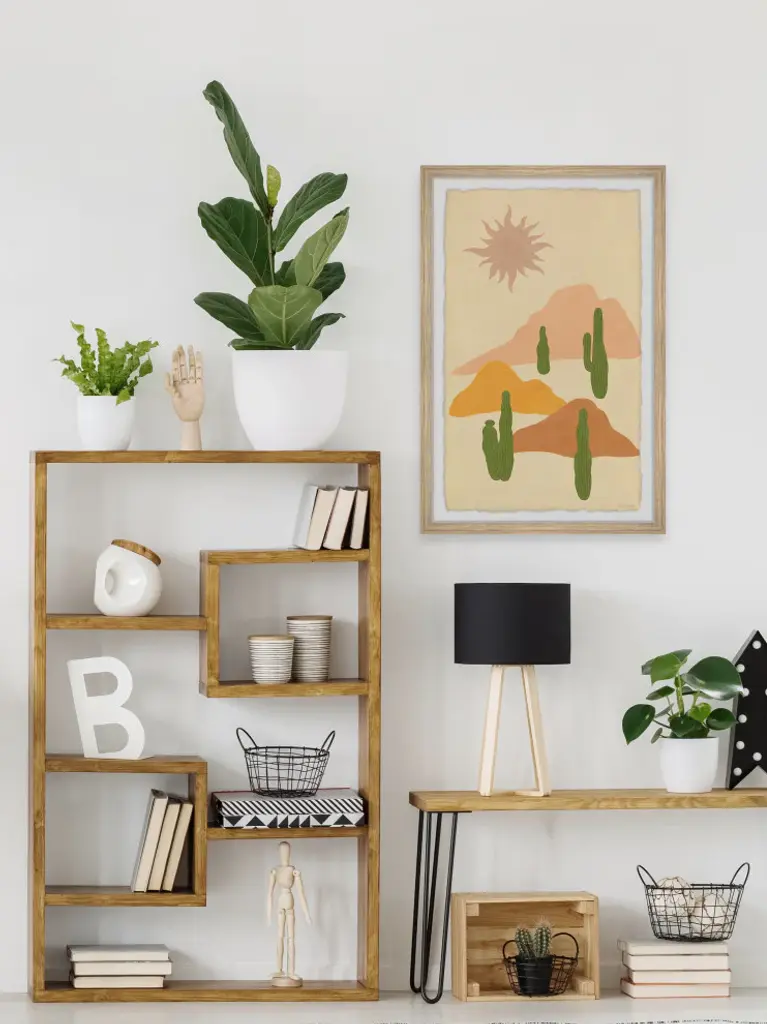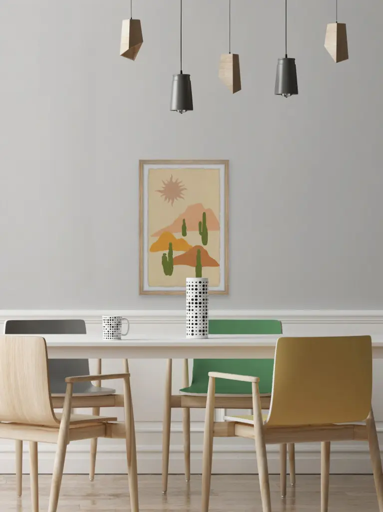 This desert-themed acrylic painting print features various mountains, cacti, and a whimsical sun in the sky. Proudly printed in the USA, this piece is printed on high quality archive paper and professionally hand-framed. With wall-mounting hooks included, this artful accent is ready to hang up as soon as it reaches your front door.- Top quality Giclee print on high resolution Archive Paper- Hand cut deckled edges- High quality durable non-warping frame- Finished under shatter resistant plexiglass- Arrives ready to hang- Includes a certificate of authenticity- Printed in the USA