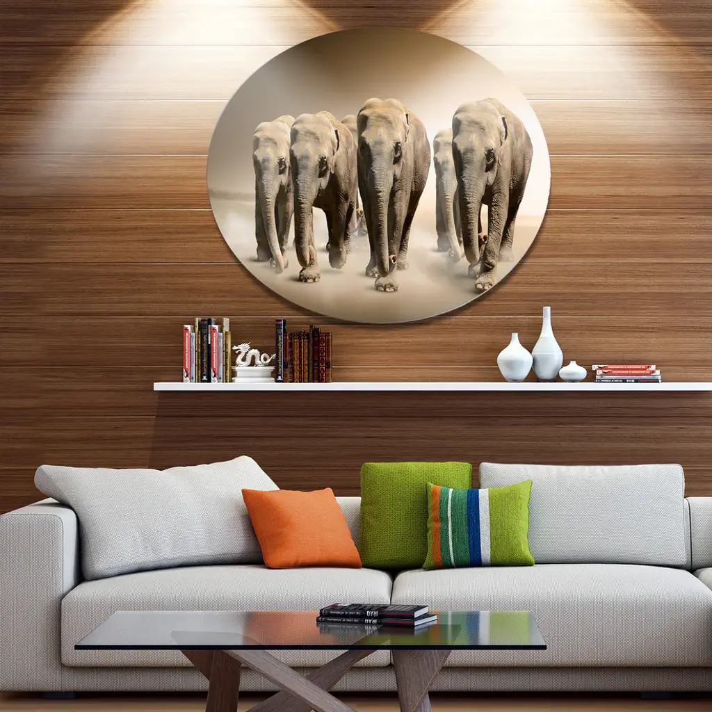 Walking Herd Of Elephants, Animal Large Disc Metal Wall Art, 36"