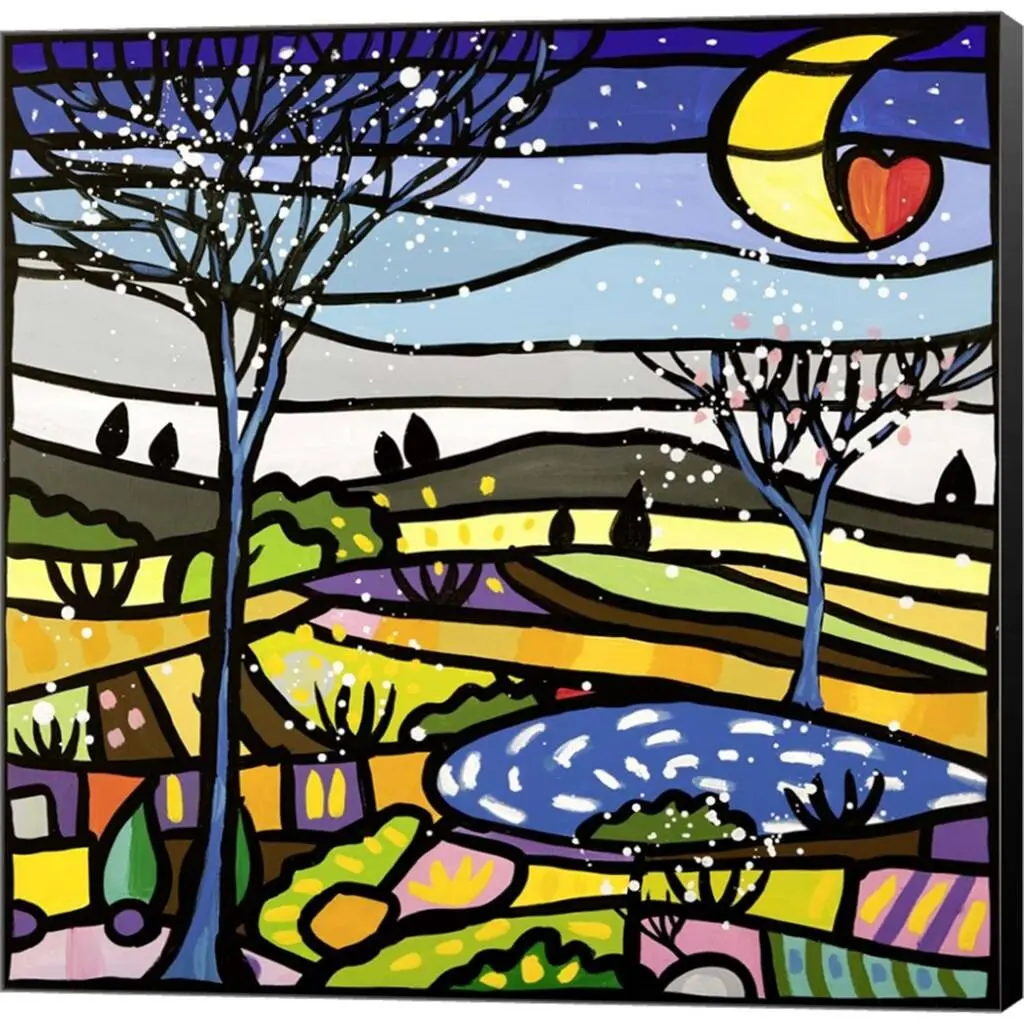 Notte Serena by Wallas is a high quality piece of canvas artwork. The finished size of this piece is 24" X 24", and it has a depth 1.5" with black painted sides. There is a UV protective coating over the entire image, and it is ready to hang on your wall with a standard drywall screw (not included). 100% Satisfaction Guaranteed.