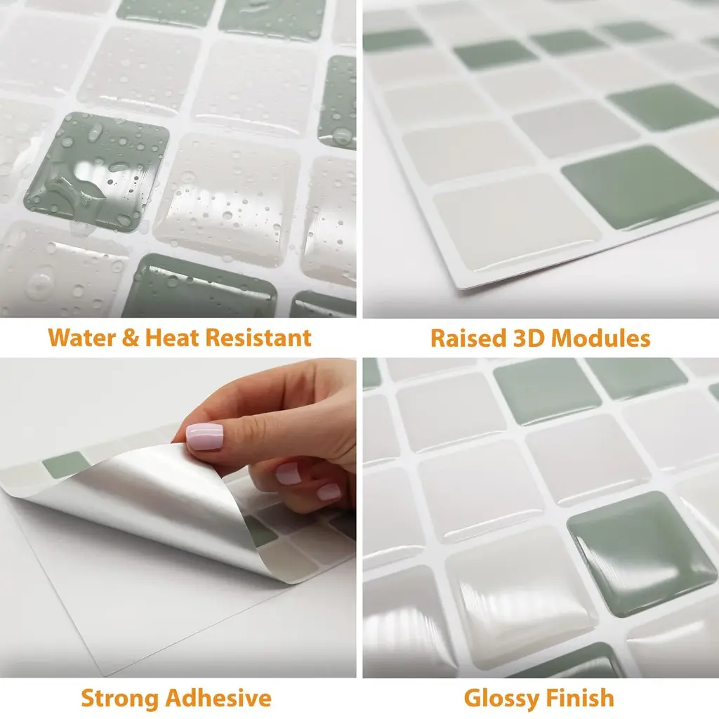 Transform your kitchen or bathroom with ease using Walplus Small Square Mosaic Tile Sticker. These 3D sticker tiles provide an instant upgrade to your space without the need for traditional tiles. Simply peel and stick onto any clean, flat surface to create a new look within minutes. The tiles are made of epoxy material, ensuring long-lasting durability and water and fire resistance. Each package contains 12 pieces of stickers that cover an area of 0.54 square meters. You can easily trim or cut the stickers to fit your desired space. Please note that you should wait at least three weeks after painting before attaching the stickers to the painted surface and clean the surface prior to application.Features: