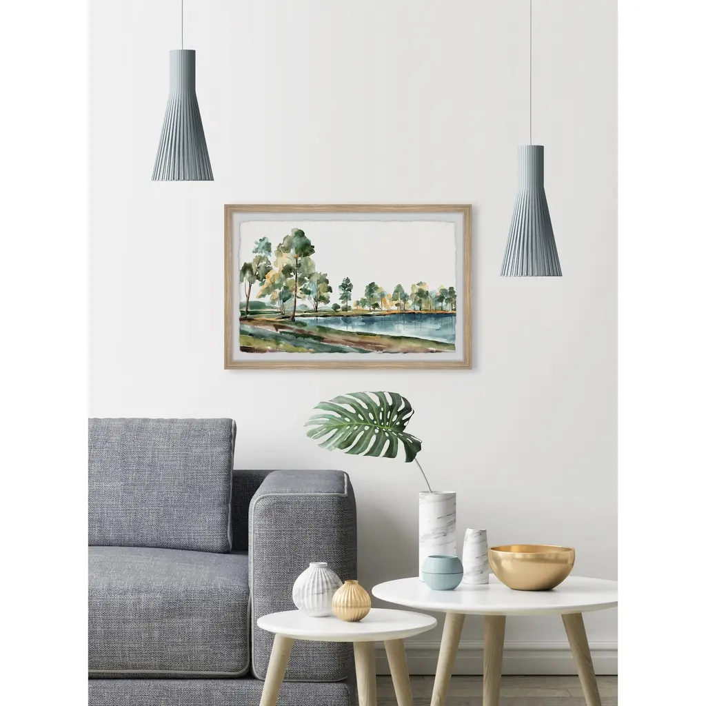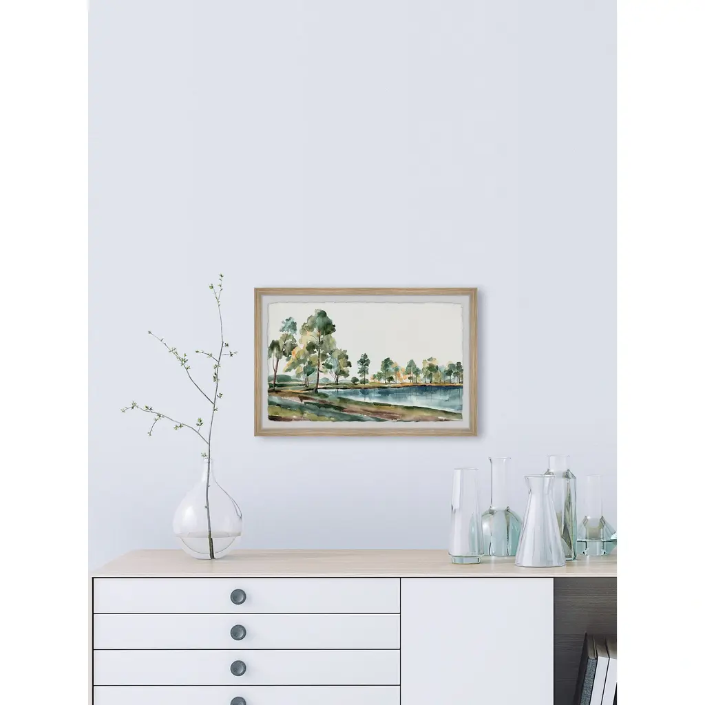 Show off your love for the outdoors with this watercolor painting print that features a blue pond surrounded by gorgeous greenery. Proudly printed in the USA, this piece is printed on high quality archive paper and professionally hand-framed. With wall-mounting hooks included, this artful accent is ready to hang up as soon as it reaches your front door. • Top quality Giclée print on high resolution Archive Paper • Hand cut deckled edges • High quality durable non-warping frame • Finished under shatter resistant plexiglass • Arrives ready to hang • Includes a certificate of authenticity • Printed in the USA