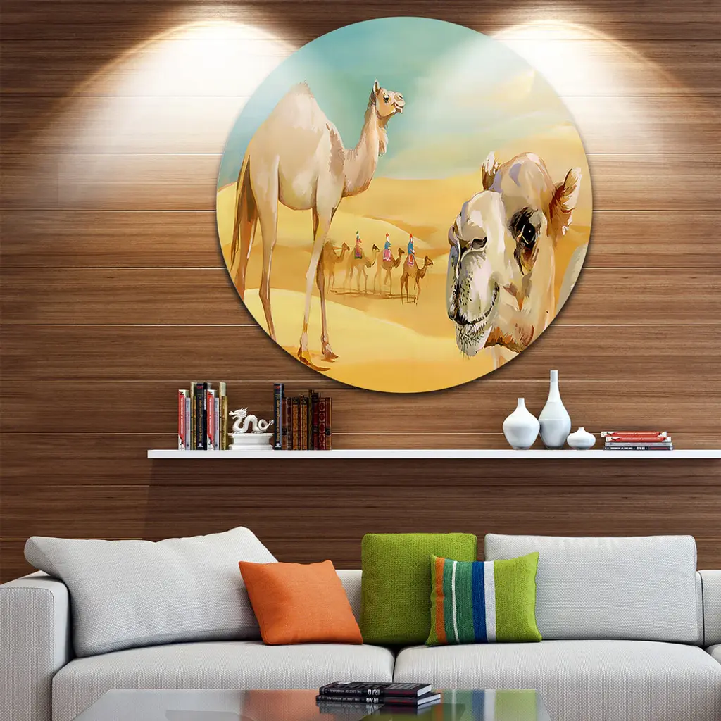 Wandering Camels In Desert, Watercolor Animal Disc Metal Wall Art, 11"