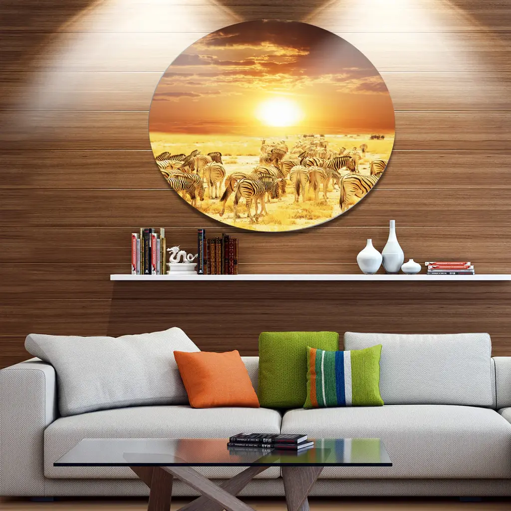 Bring Contemporary Abstraction to your home with this large Circle Metal wall art. This Wandering Herd of Zebra At Sunset Metal Artwork makes it the focal point of any room or office. - White Gloss Coating ensures colors are extra vibrant with light reflection.- Aluminum grade Sheet Metal with 1 inch mounting frame on the back giving the illusion that the artwork is floating on the wall..- Mounting Brackets are included along with instructions.- High Quality Digital images are created directly into a glossy aluminum panel producing a stunning and captivating print into the glossy finish of the metal.- Water, Fire and Scratch resistant HD Aluminum panels.- Looks better than any photo paper and guaranteed to last at least 20 years- Easy to clean with a microfiber cloth. Colors are far superior to regular Canvas Art. - Easy to Hang