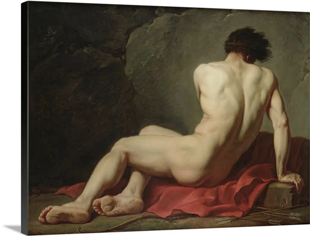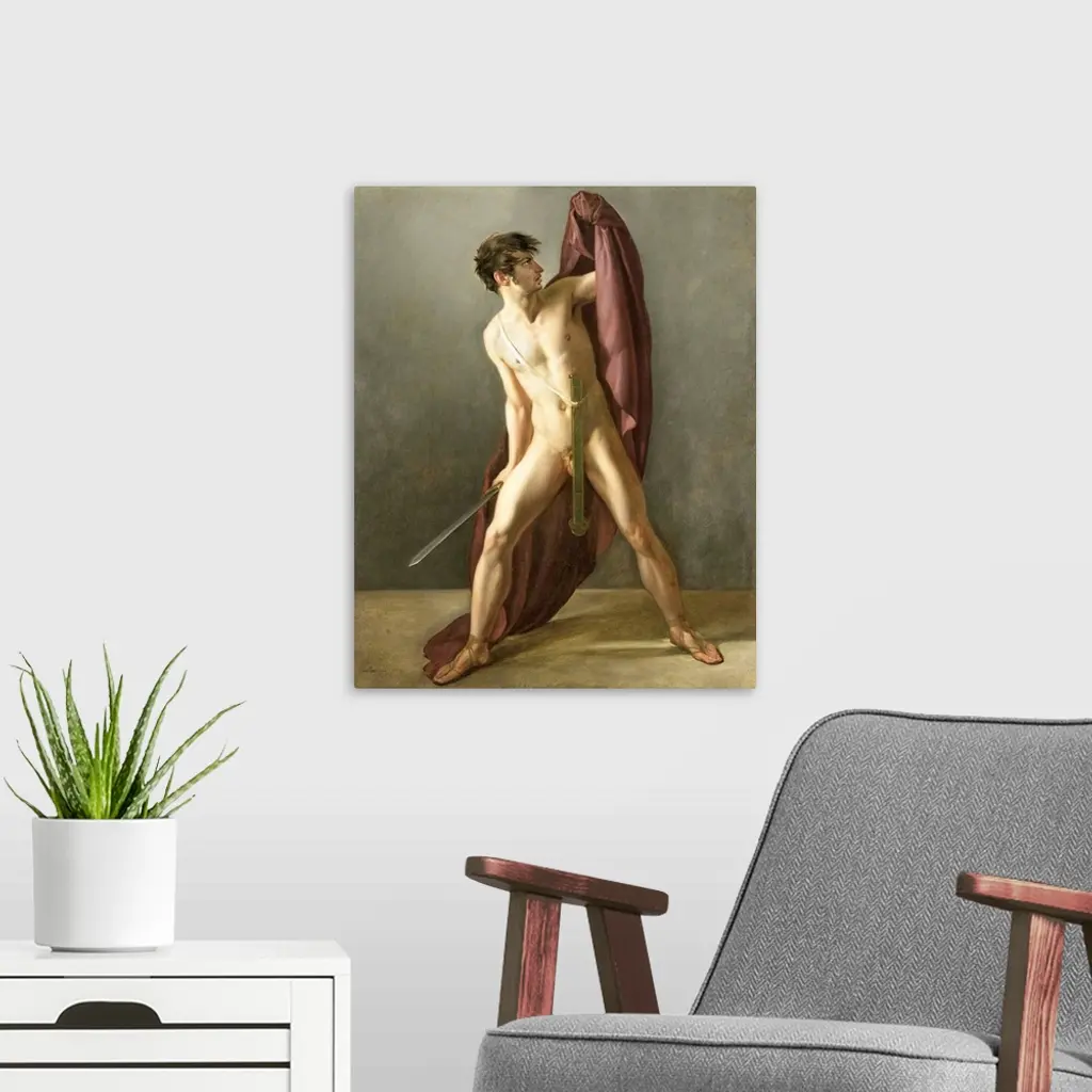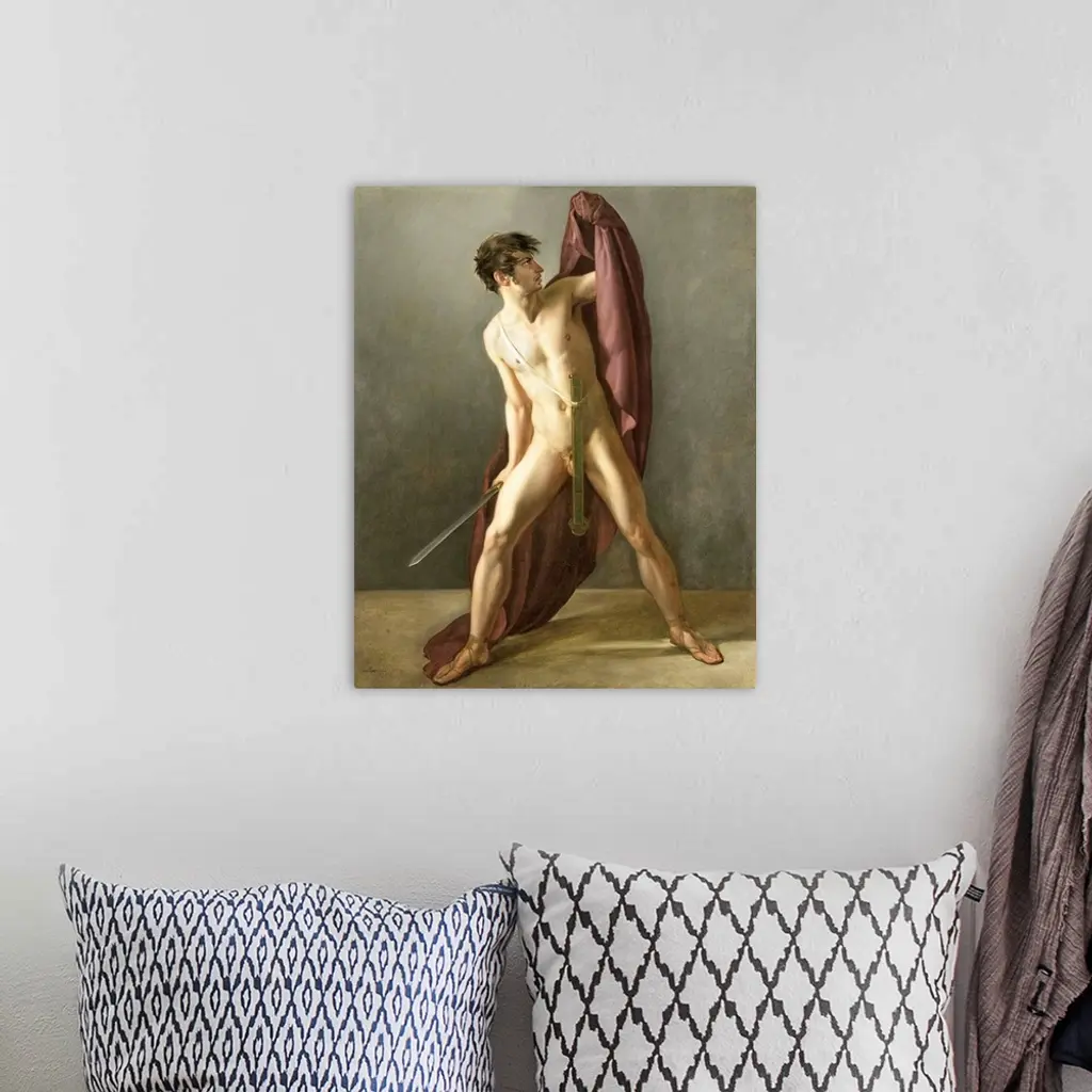 Warrior with Drawn Sword, Joannes Echarius Carolus Alberti, 1808, Dutch painting, oil on canvas. Nude warrior with sword drawn.