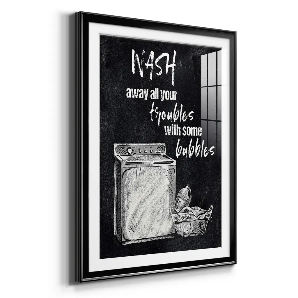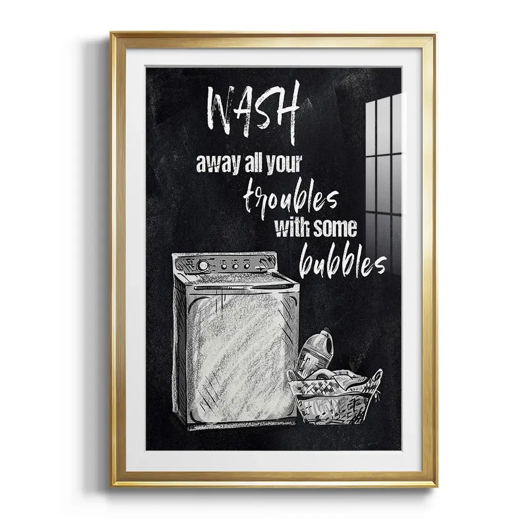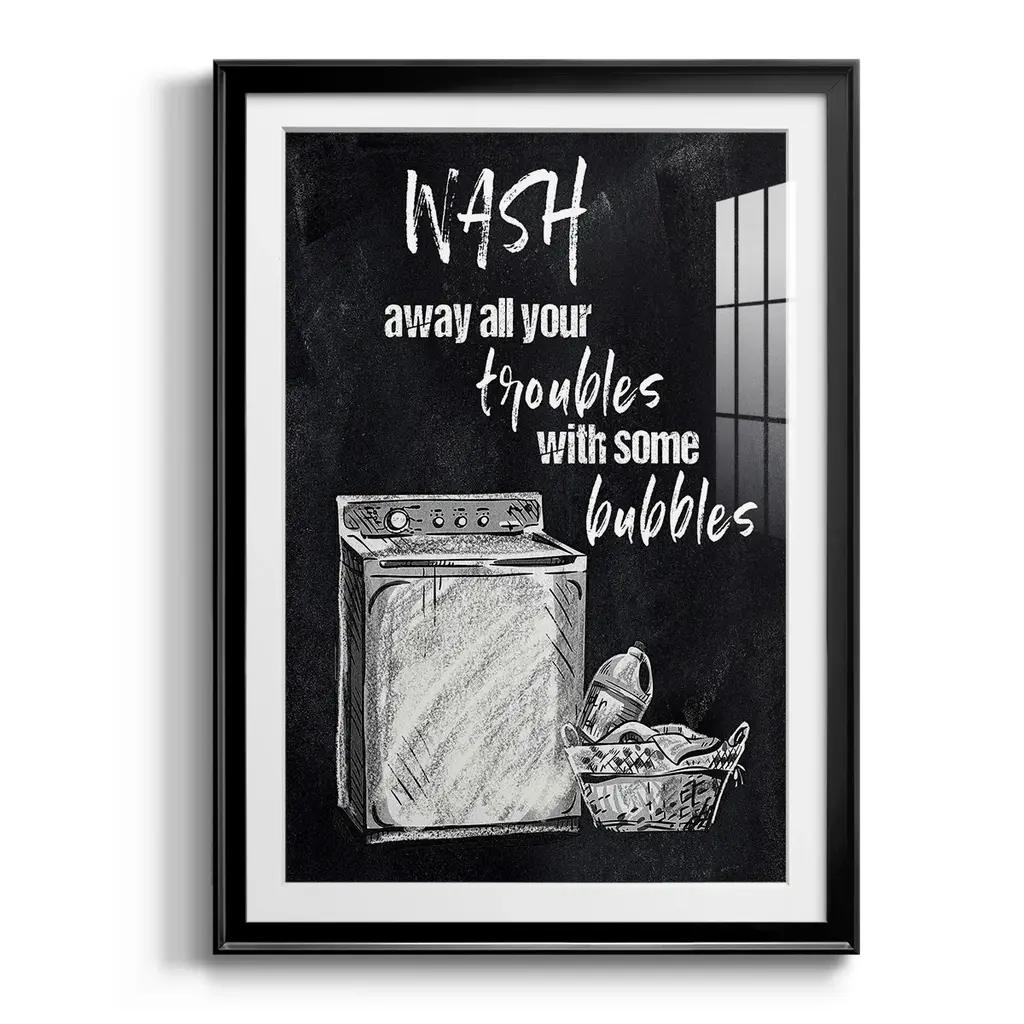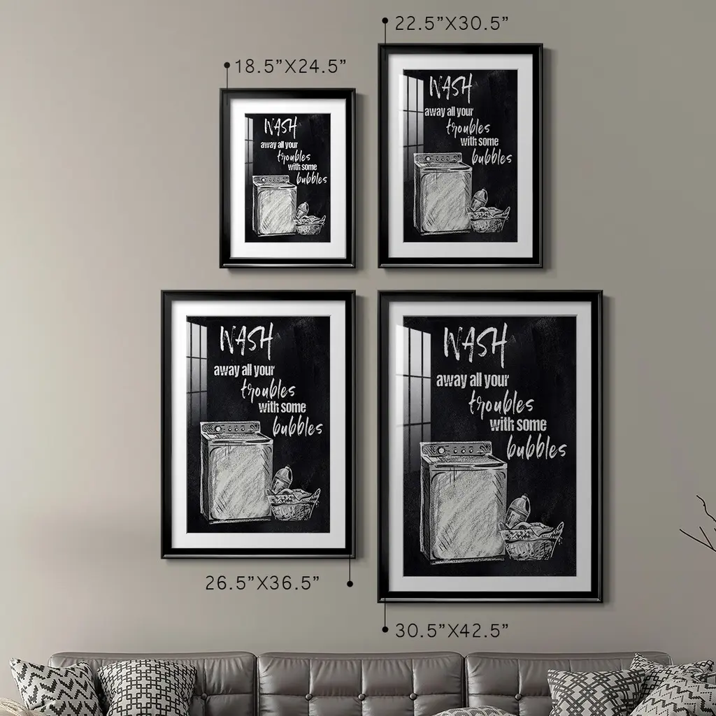 Wash Away Your Troubles Premium Framed Print - Ready to Hang A Premium Framed Print created to last. Framed in distressed wood and available in an array of sizes and colors Featuring a beveled a solid wood stretcher bar, each piece comes ready to hand 4 SIZES AVAILABLE 30.5''X42.5'' - Overall Size 26.5'X36.5'' - Overall Size 22.5''x30.5'' - Overall Size 18.5''x24.5'' - Overall Size Each piece is made to order. Each piece comes with hanging hardware. Made in the USA Ready to Hang Giclee Paper Print Acrylic Glass Beveled Matt Board