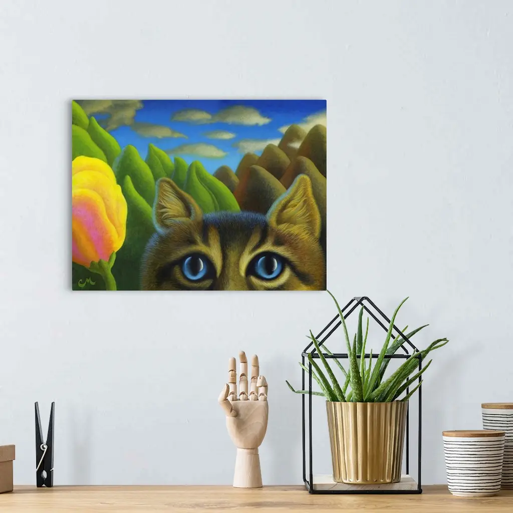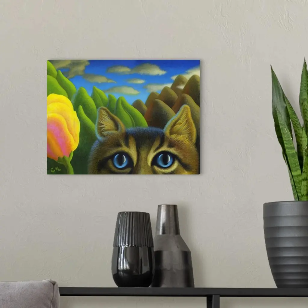Surrealistic painting of a cat with an abstracted landscape in the background.