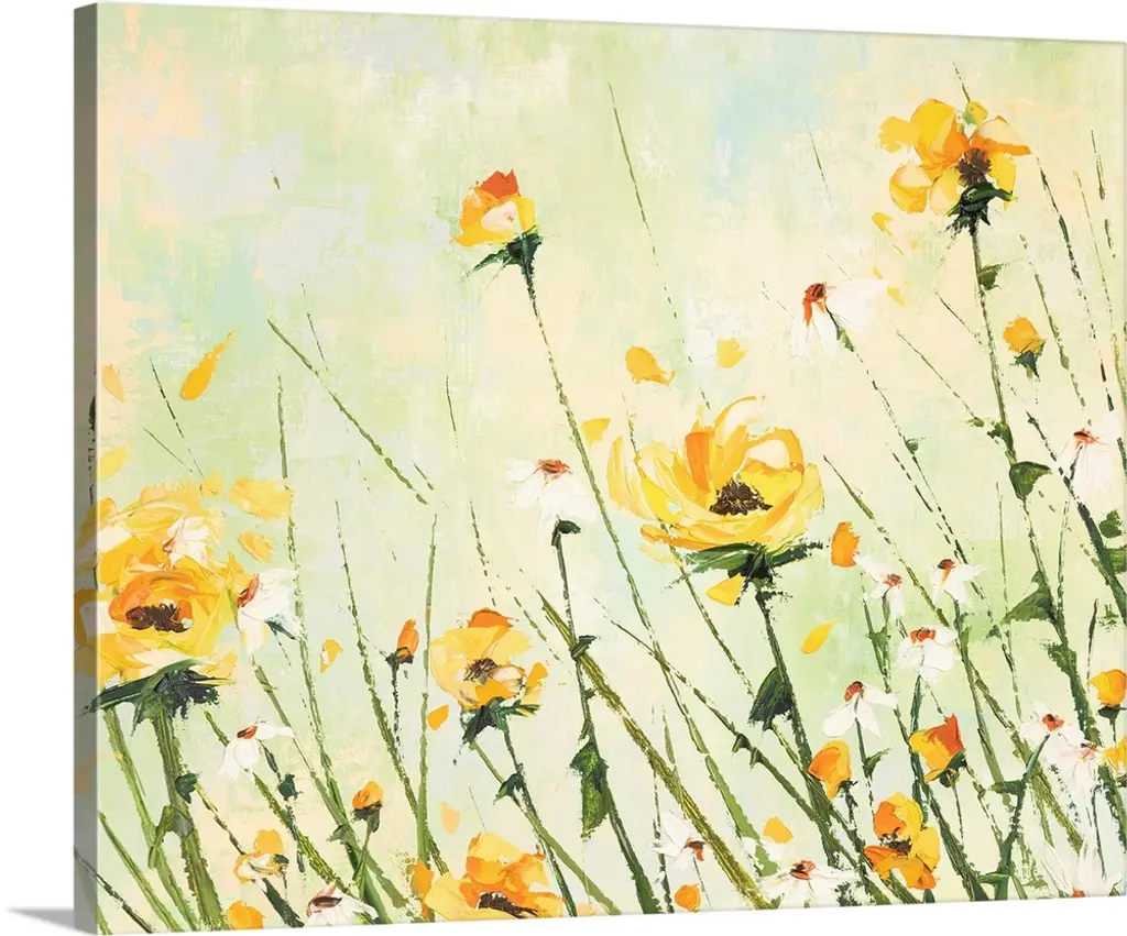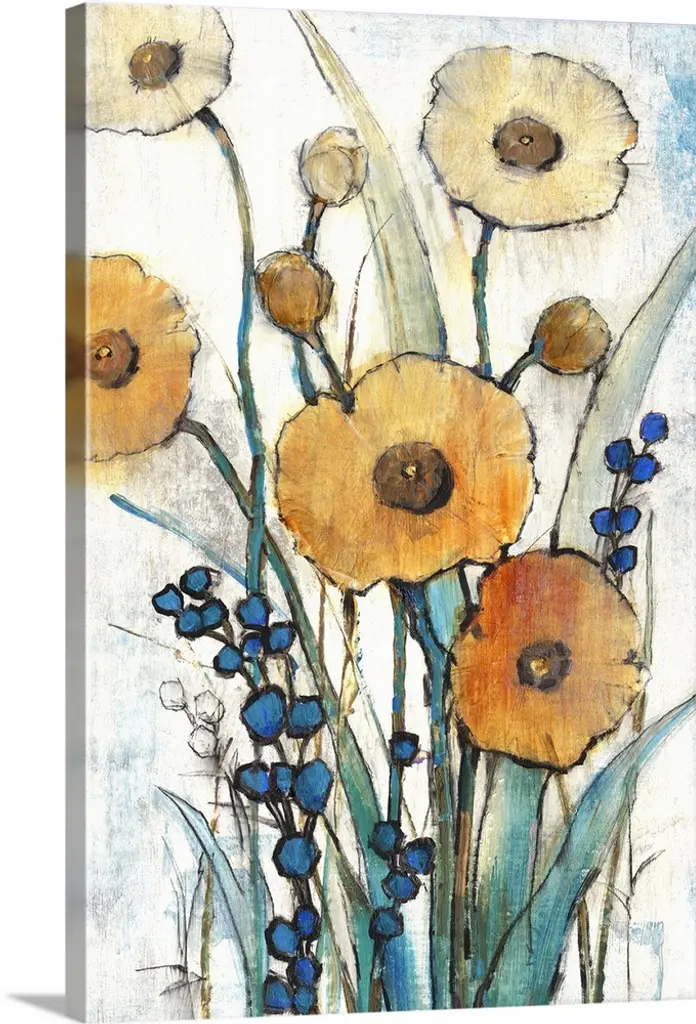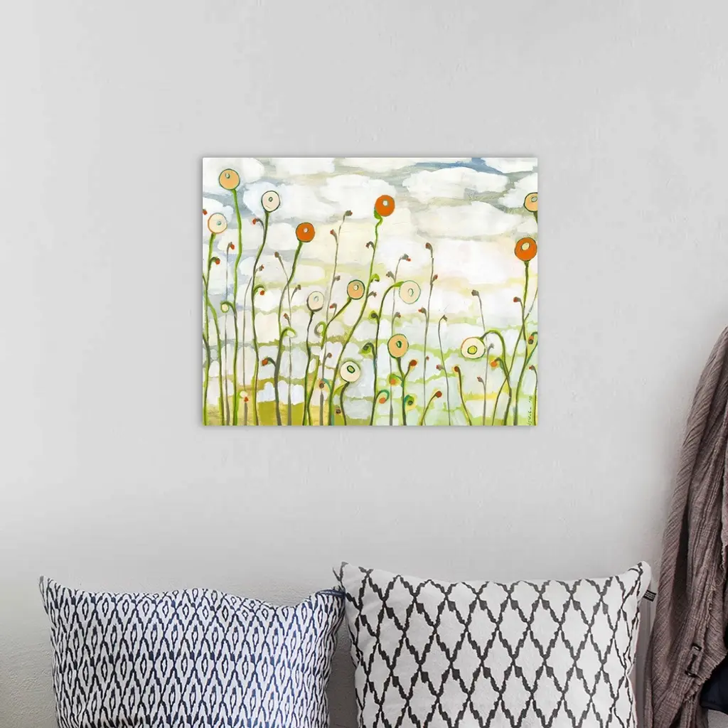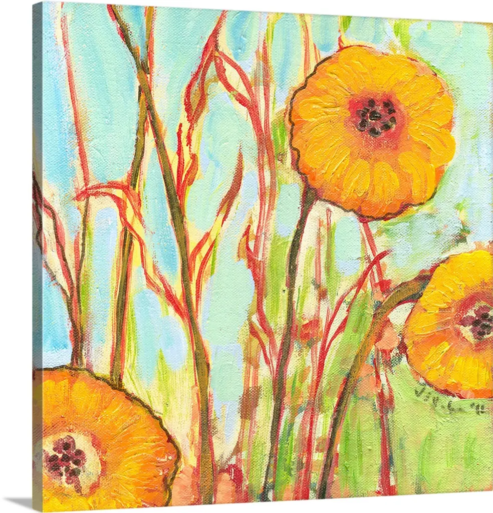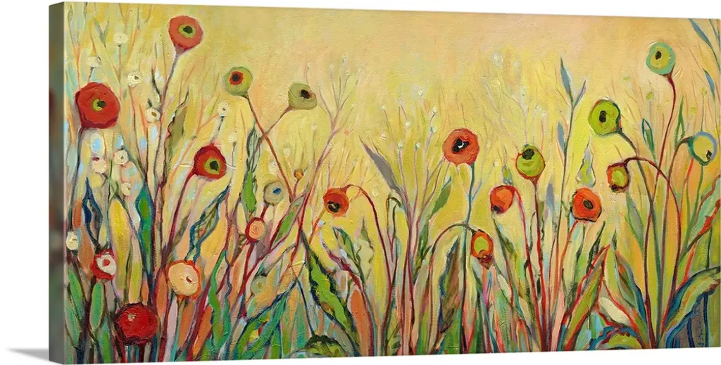 A contemporary abstract landscape painting of poppy flowers and a cloudy sky in the background.
