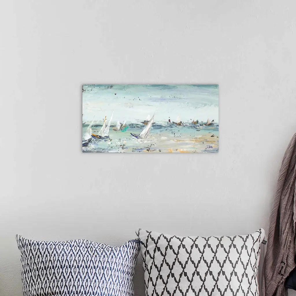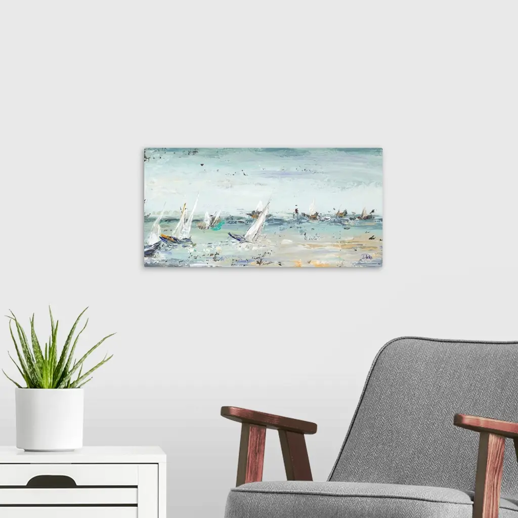 Contemporary painting of several sailboats in the middle of the ocean with some rough waves and visual paint texture.