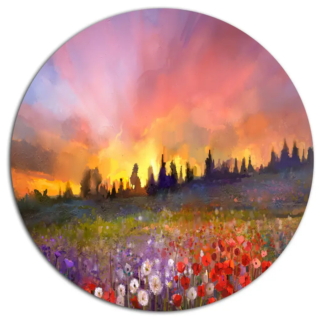 Bring Contemporary Abstraction to your home with this large Circle Metal wall art. This Water and Pink Trees in Desert Metal Artwork makes it the focal point of any room or office. - White Gloss Coating ensures colors are extra vibrant with light reflection.- Aluminum grade Sheet Metal with 1 inch mounting frame on the back giving the illusion that the artwork is floating on the wall..- Mounting Brackets are included along with instructions.- High Quality Digital images are created directly into a glossy aluminum panel producing a stunning and captivating print into the glossy finish of the metal.- Water, Fire and Scratch resistant HD Aluminum panels.- Looks better than any photo paper and guaranteed to last at least 20 years- Easy to clean with a microfiber cloth. Colors are far superior to regular Canvas Art. - Easy to Hang
