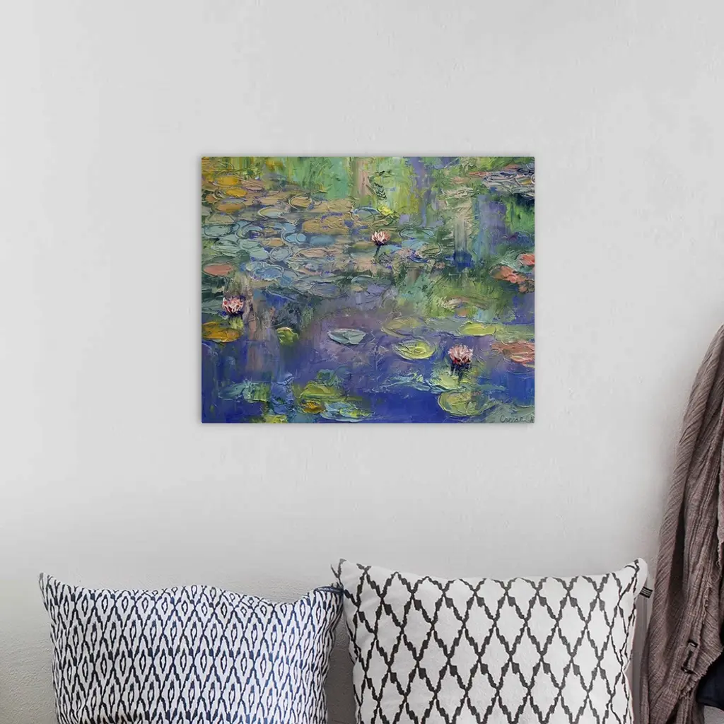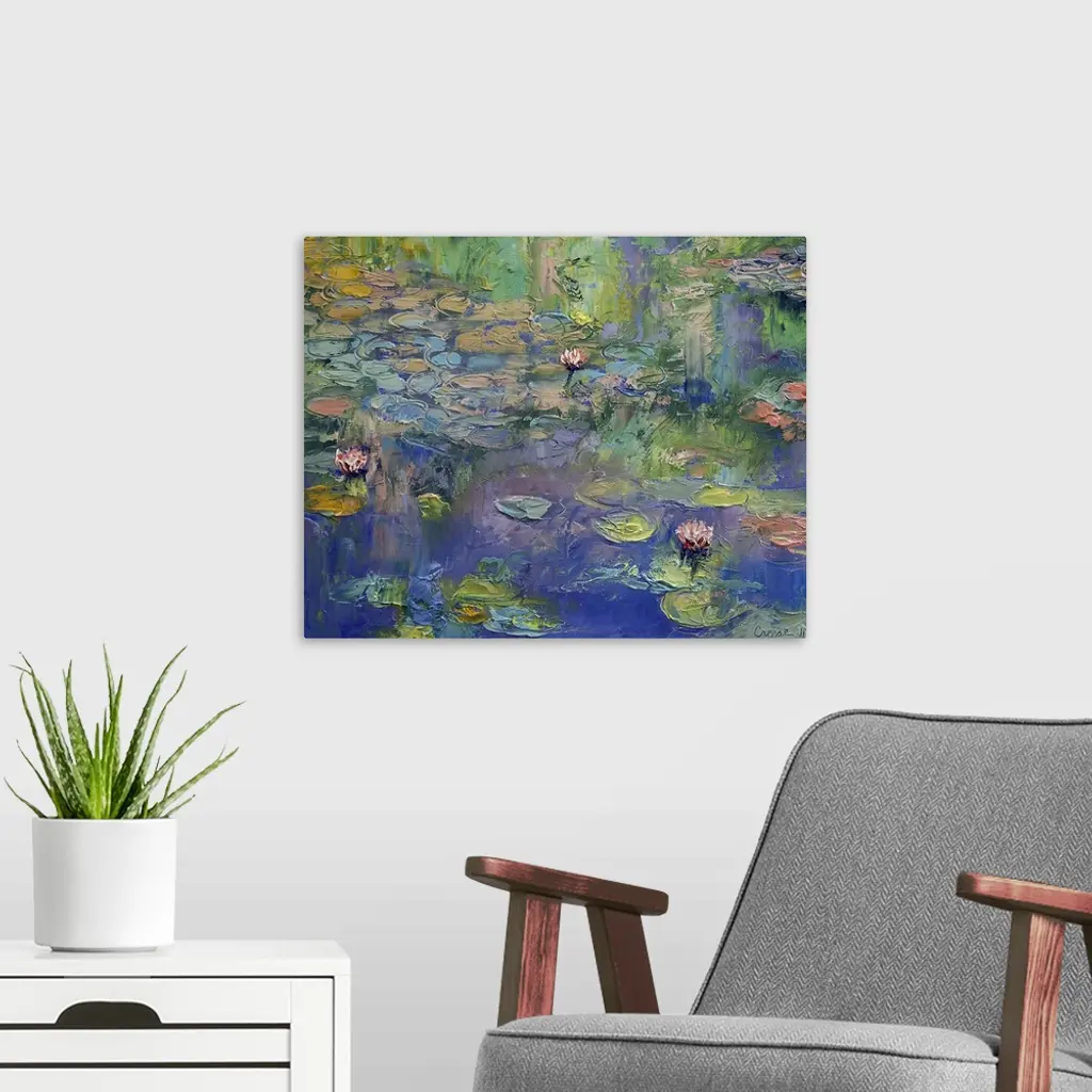 Contemporary artwork of a classic subject matter this oil painting captures lily pads and lotus blossoms floating on the surface of a garden pond reflecting the ultramarine sky and viridian grasses growing on the shore.