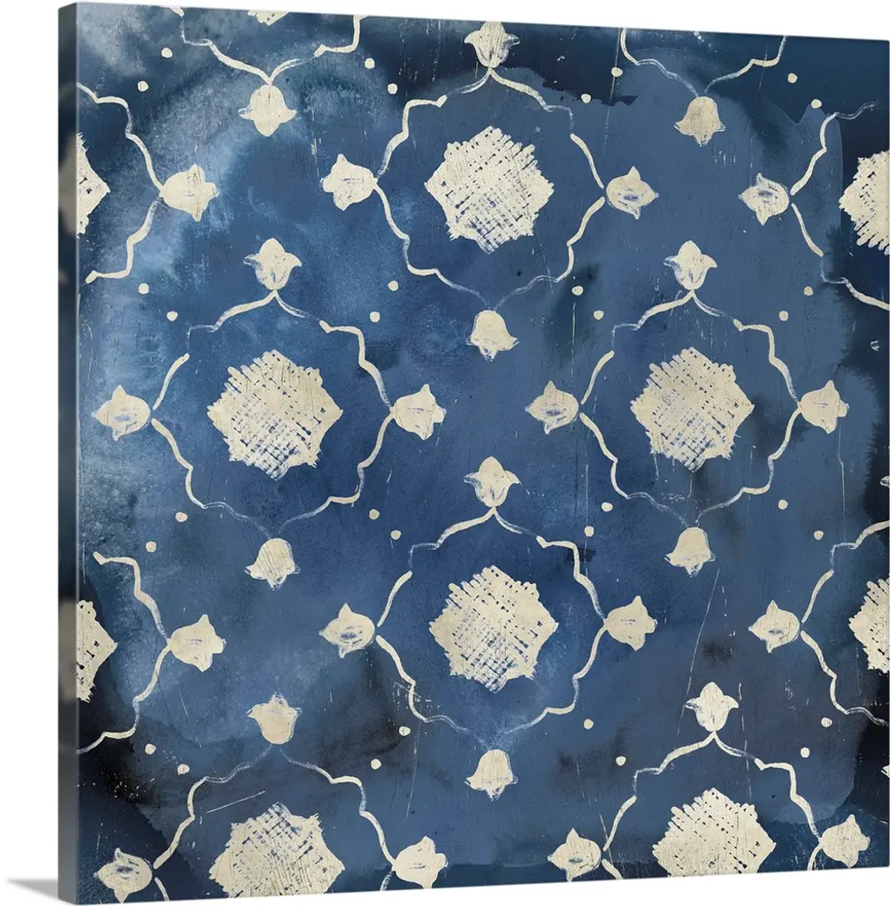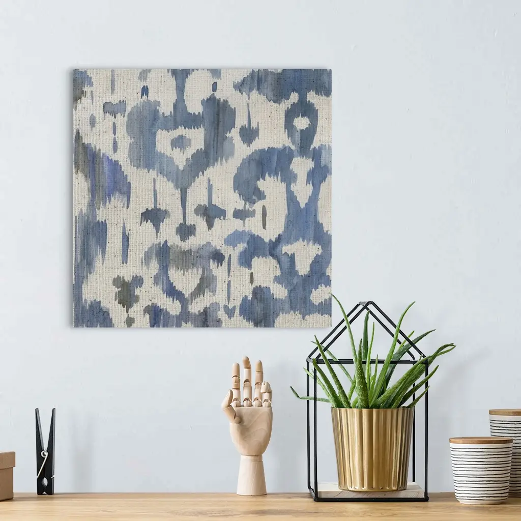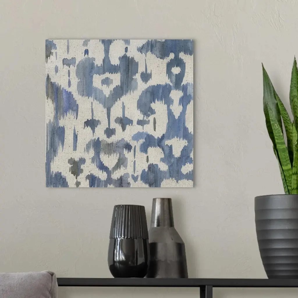 Watercolor painting of decorative patterns in shades of blue and gray on a textured linen backdrop.
