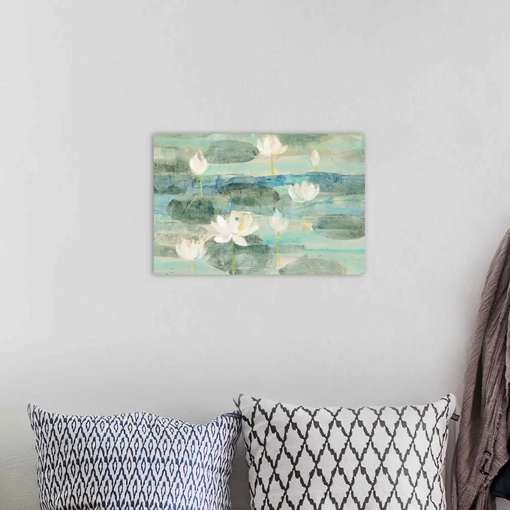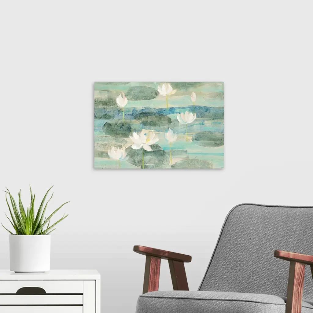 Large abstract painting of white lilies and green lily pads floating in water made with shades of blue.