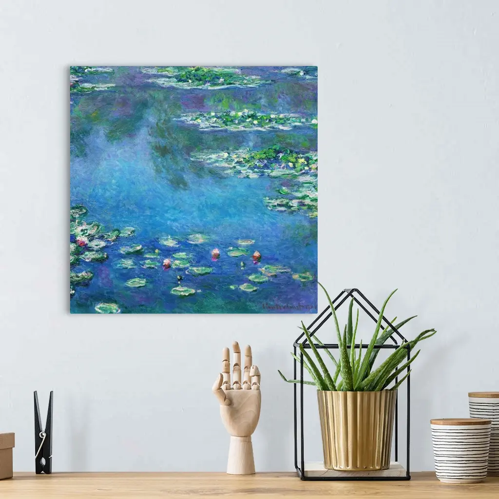 "One instant, one aspect of nature contains it all," said Claude Monet, referring to his late masterpieces, the water landscapes that he produced at his home in Giverny between 1897 and his death in 1926. These works replaced the varied contemporary subjects he had painted from the 1870s through the 1890s with a single, timeless motif - water lilies. The focal point of these paintings was the artist's beloved flower garden, which featured a water garden and a smaller pond spanned by a Japanese footbridge. In his first water-lily series (1897 - 99), Monet painted the pond environment, with its plants, bridge, and trees neatly divided by a fixed horizon. Over time, the artist became less and less concerned with conventional pictorial space. By the time he painted Water Lilies, which comes from his third group of these works, he had dispensed with the horizon line altogether. In this spatially ambiguous canvas, the artist looked down, focusing solely on the surface of the pond, with its cluster of vegetation floating amid the reflection of sky and trees. Monet thus created the image of a horizontal surface on a vertical one.